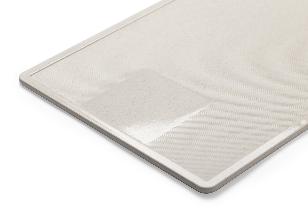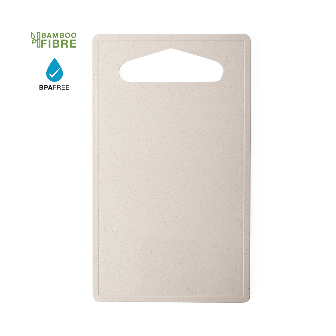 Tabla de cocina de línea nature en resistente fibra de bambú. Con troquel para fácil manejo y superficie granulada de seguridad.