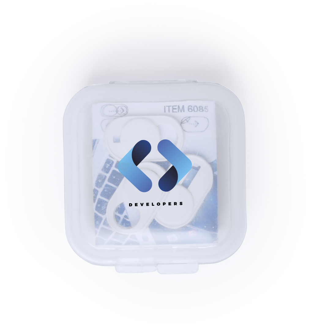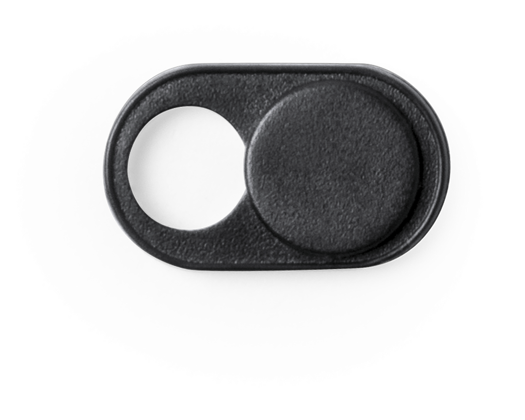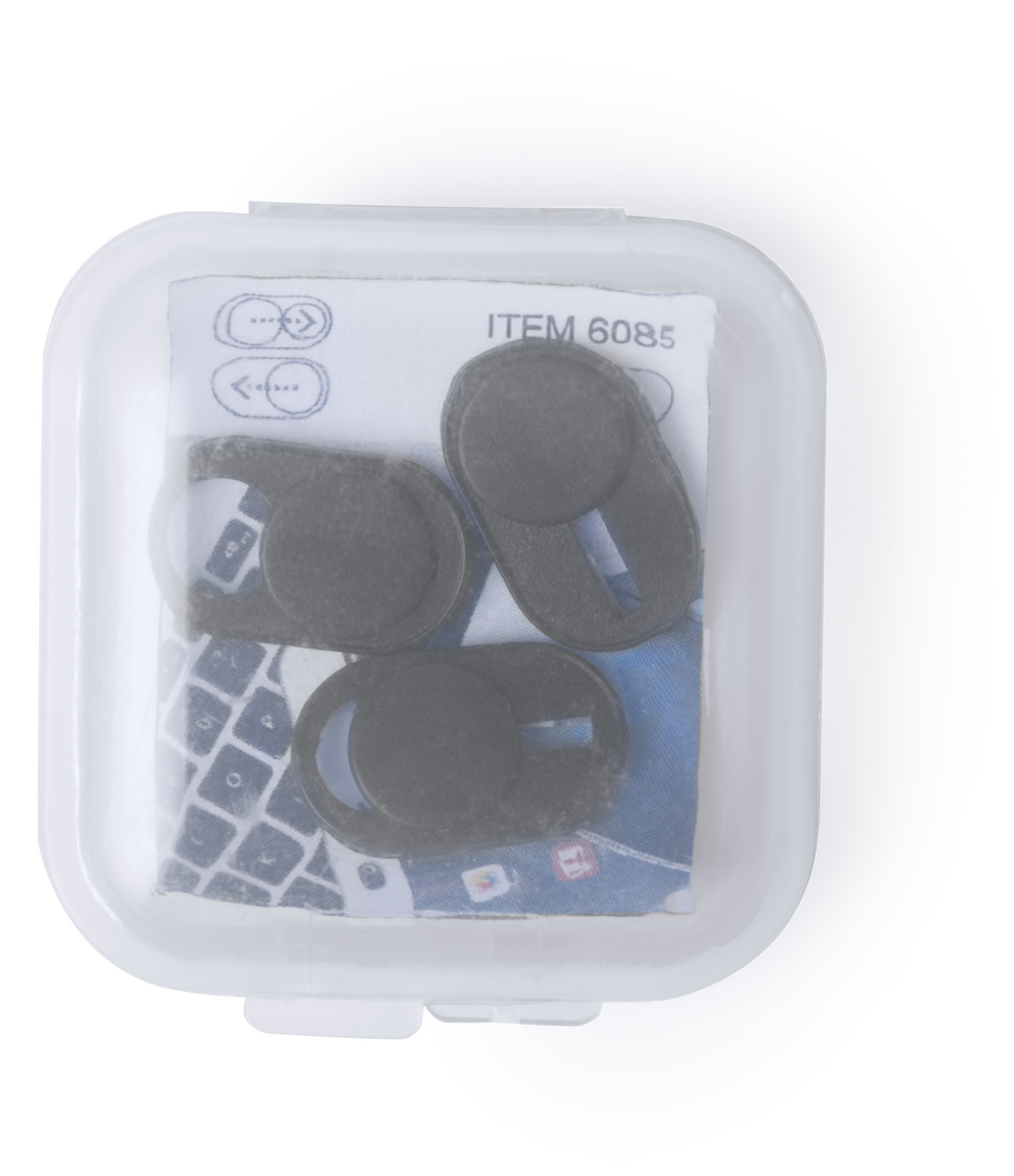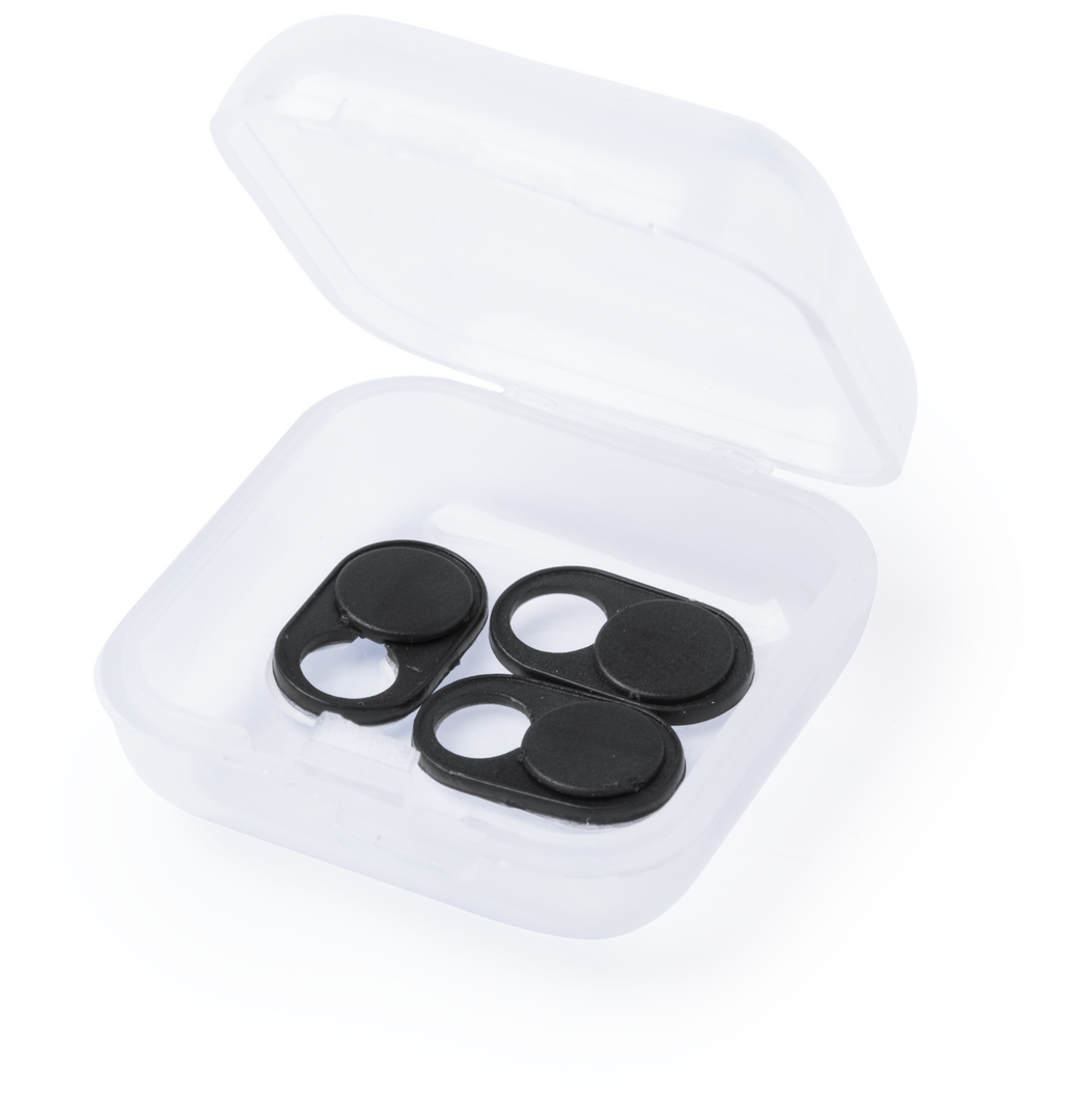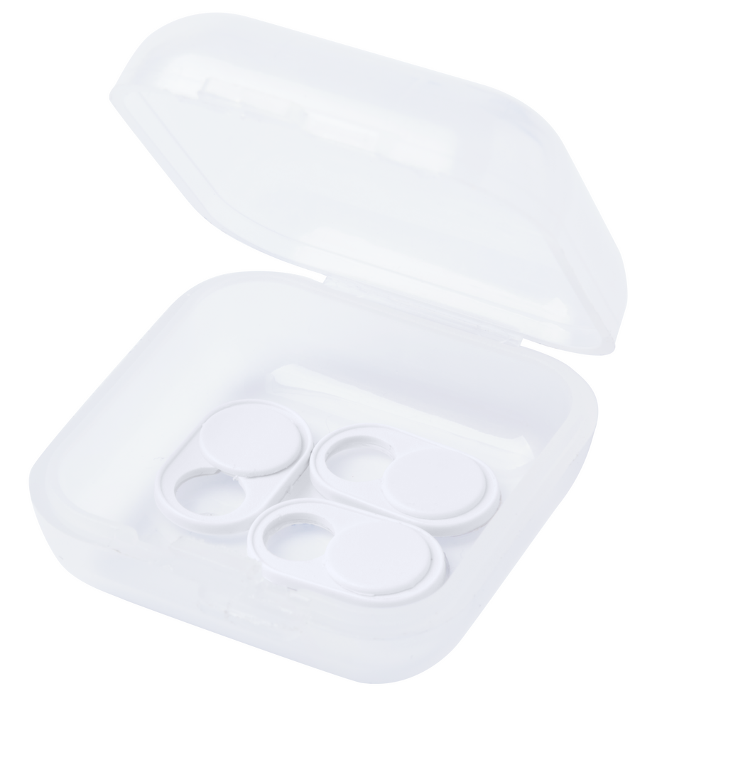 Tapa para cámara de dispositivo móvil para proteger la privacidad. En tamaño ultra compacto y servida en estuche individual de achado translúcido con 3 piezas. Disponible en colores blanco y negro, set presentado en bolsita individual con cartulina de dis Adhesivo. 3 Piezas
