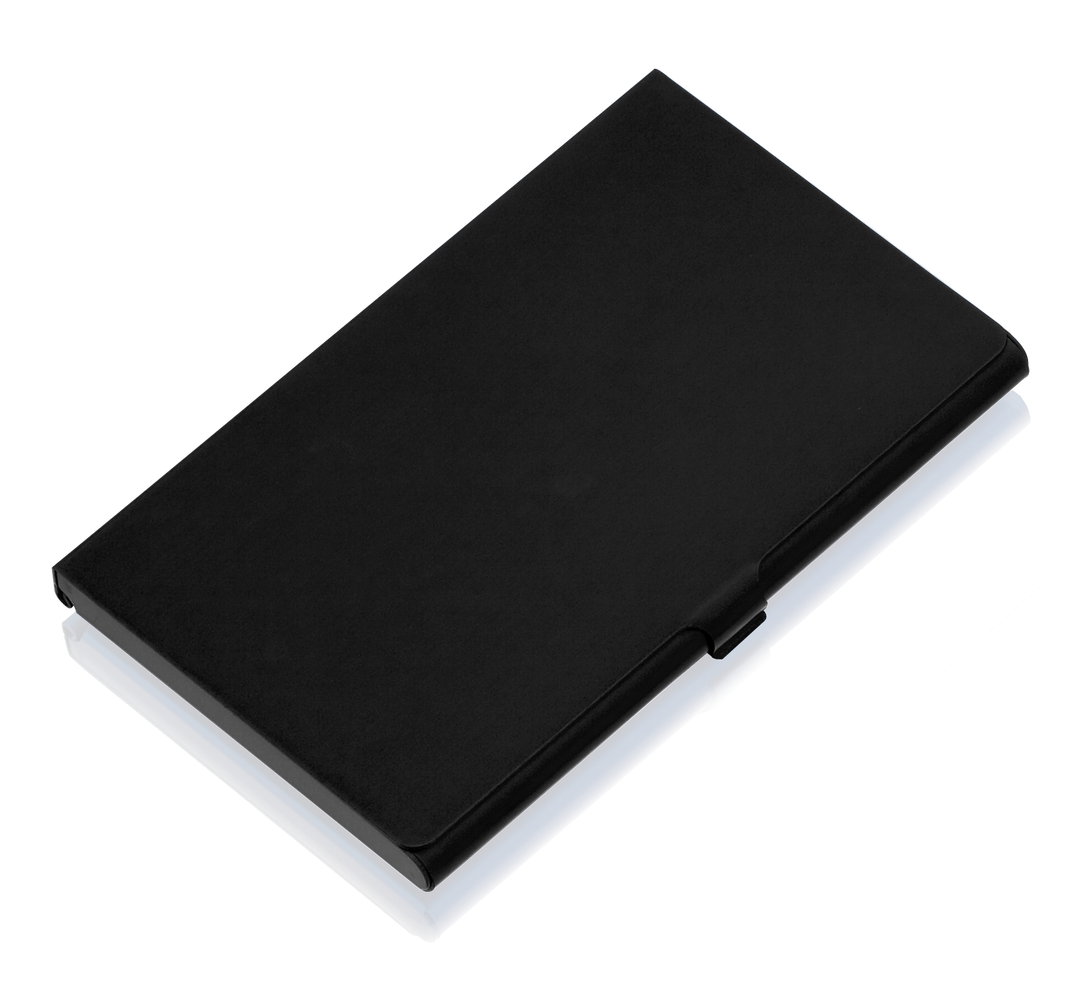 Elegante tarjetero con cuerpo en acabado de aluminio y elegantes colores. Con sistema de cierre a presión y presentado en elegante caja individual negra. 1 Compartimento