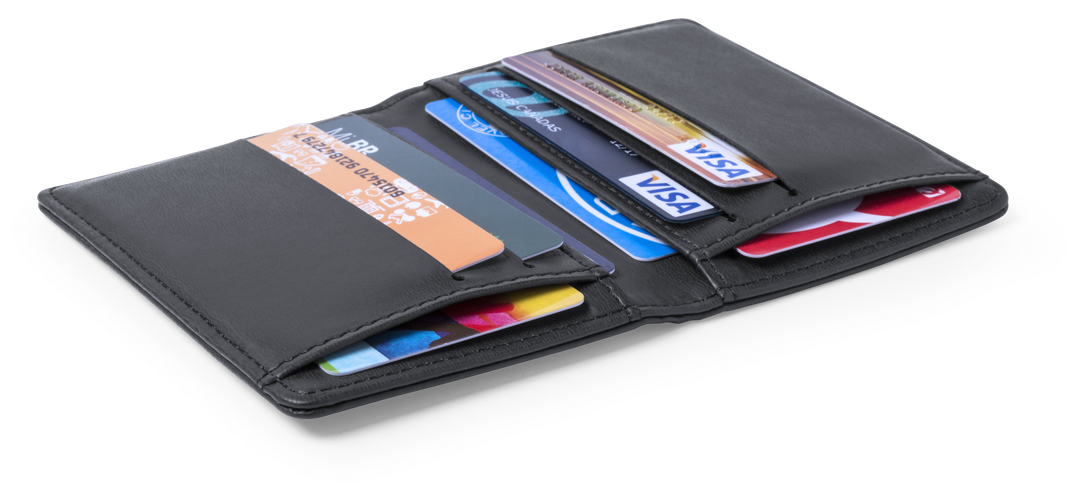 Tarjetero con tecnología de seguridad RFID (Identificación por Radio Frecuencia) que mantiene seguros tus dispositivos de transmisión de identidad. De elegante diseño, suave acabado en polipiel negra y con 8 compartimentos. Presentado en caja individual. Protector RFID. 8 Compartimentos