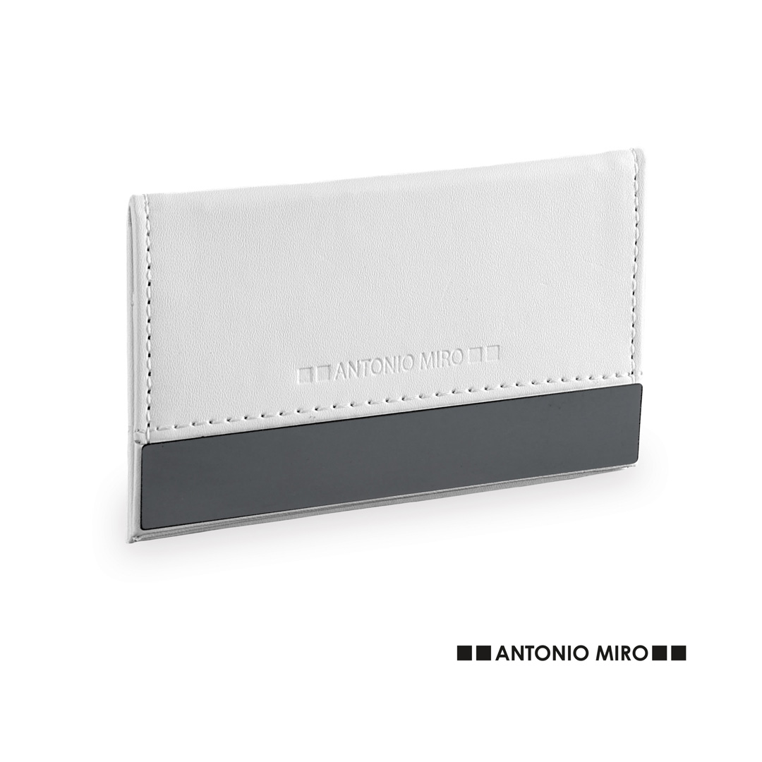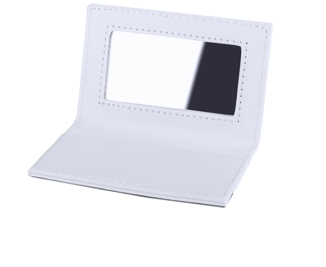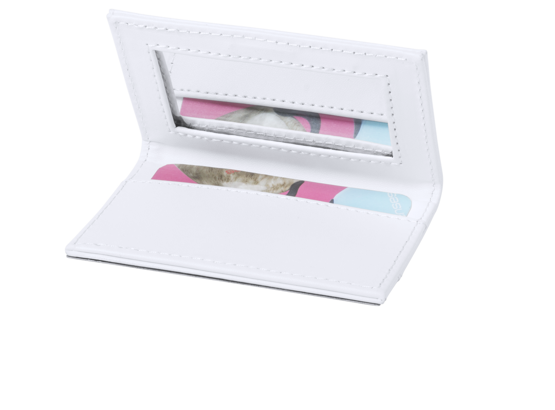 Tarjetero con espejo de Antonio Miró en suave polipiel de acabado en color blanco, con chapa exterior metálica para marcaje en láser. 1 Compartimento