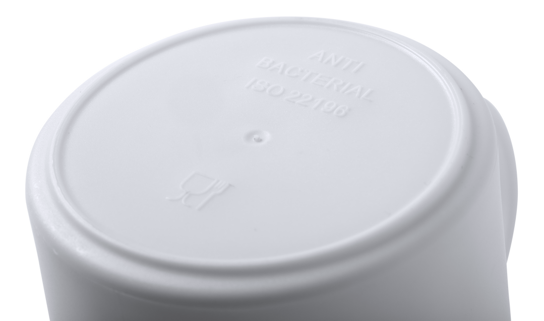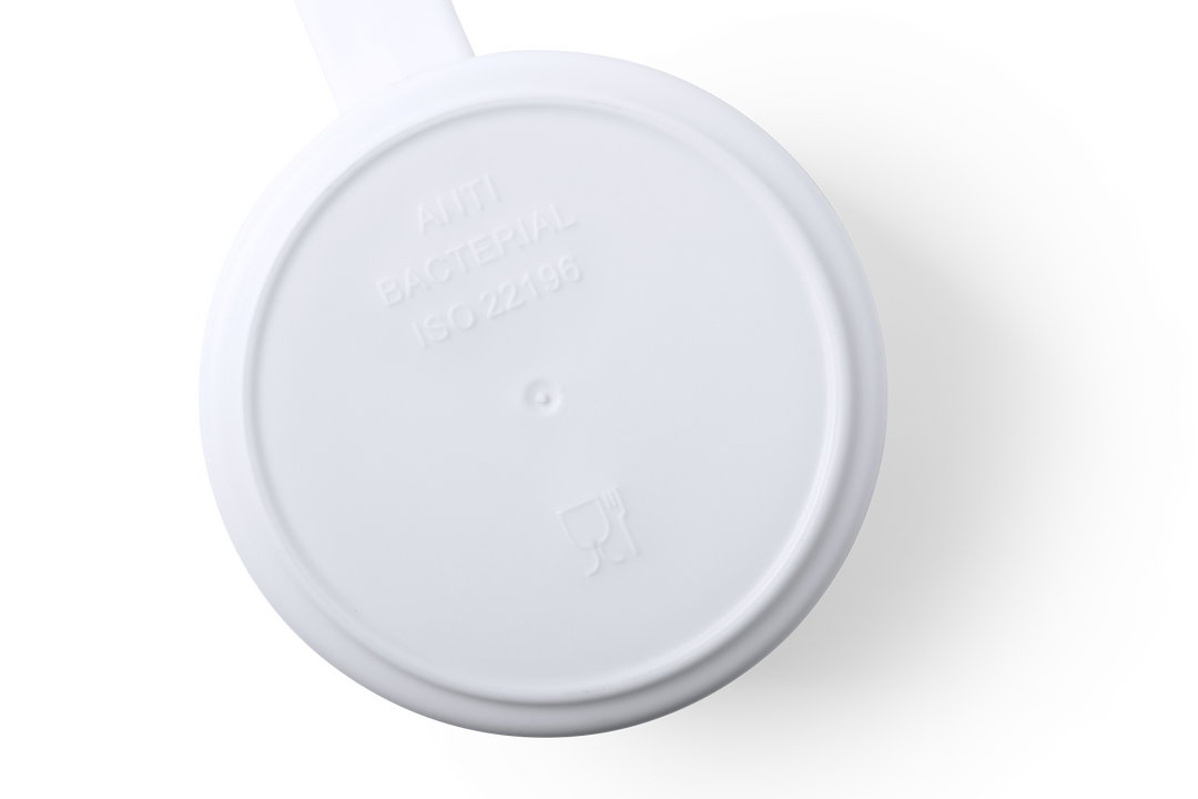 Taza antibacteriana en resistente material PP de acabado sólido y libre de BPA. 350 ml de capacidad, presentada en bolsa individual. Los productos con tratamientos antibacterianos son capaces de reducir drásticamente las cargas bacterianas presentes en l 350 ml