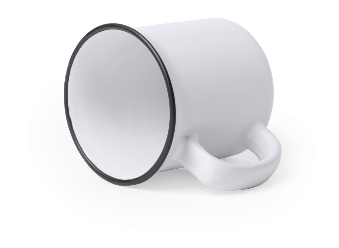 Taza de cerámica de 300ml de capacidad con diseño vintage. En sobrio diseño bicolor, con anilla en el borde. Presentada en caja individual. 300 ml. Presentación Individual