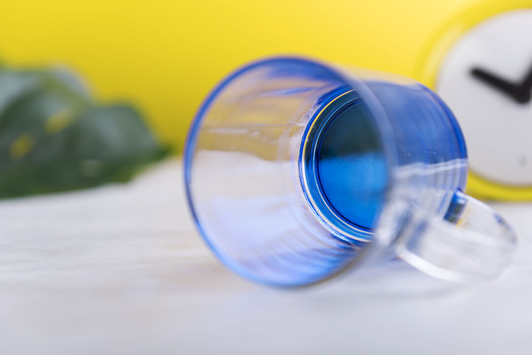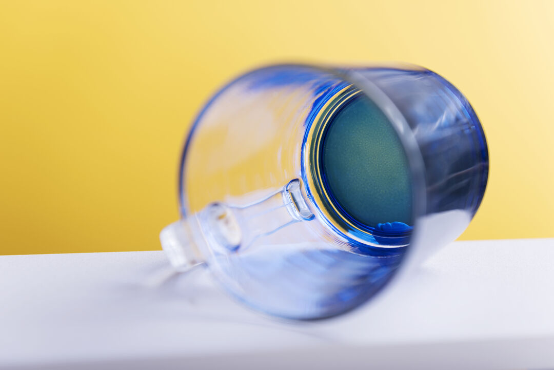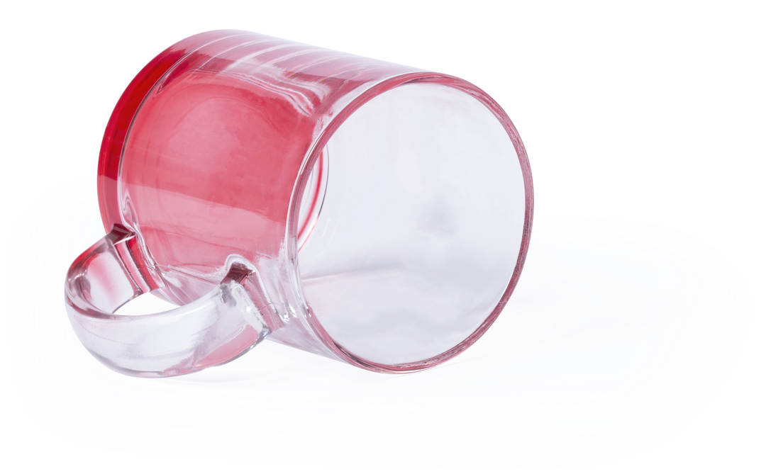 Taza de cristal de 350ml d capacidad con acabado transparente y base en variada gama de vivos colores. Presentada en caja individual. 350 ml. Presentación Individual