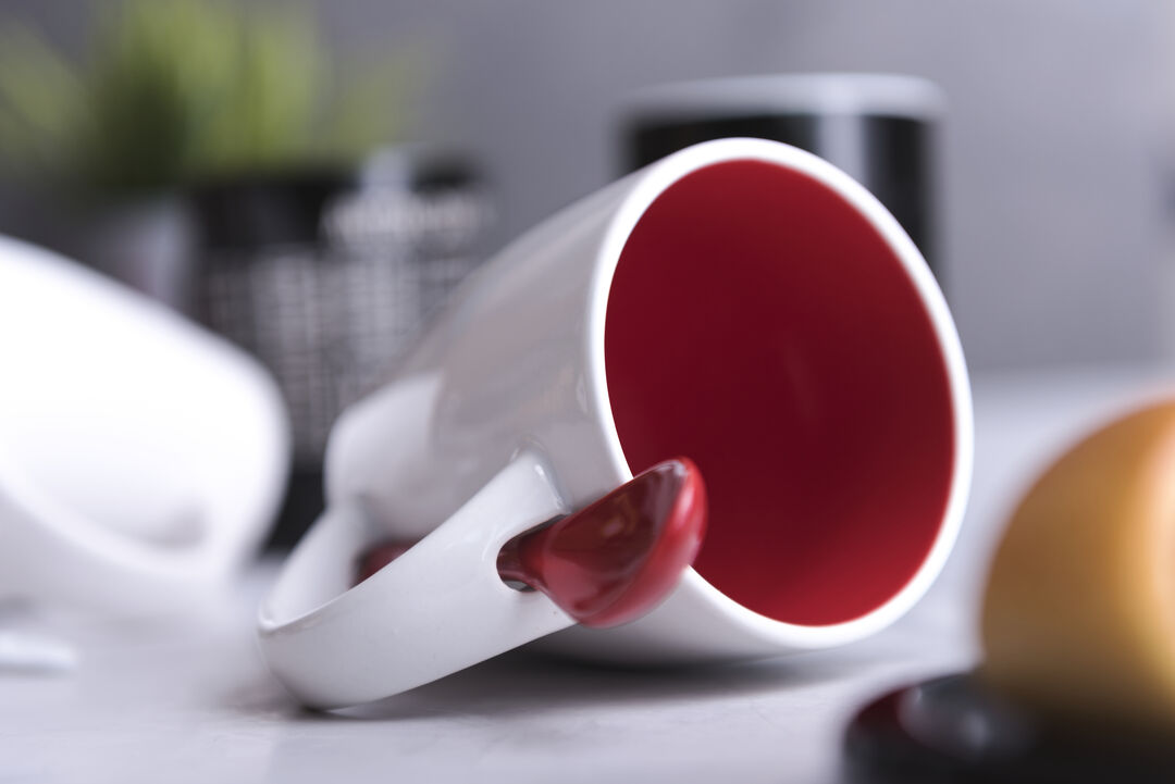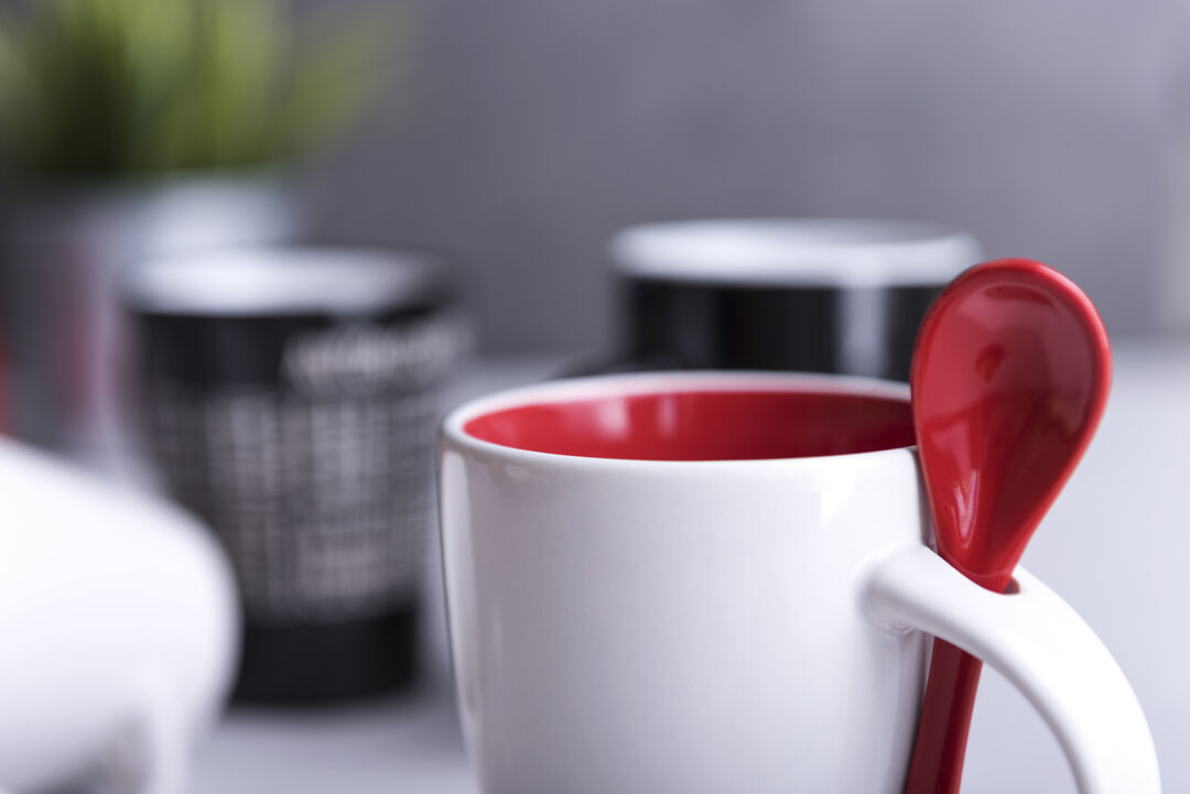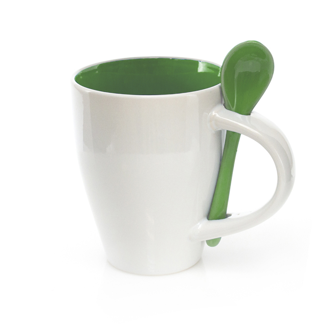 Taza de cerámica de 350ml de capacidad en divertida combinación de exterior en color blanco e interior en gama de vivos colores. Con cuchara de cerámica a juego integrada en asa y presentada en caja individual. 350 ml. Presentación Individual