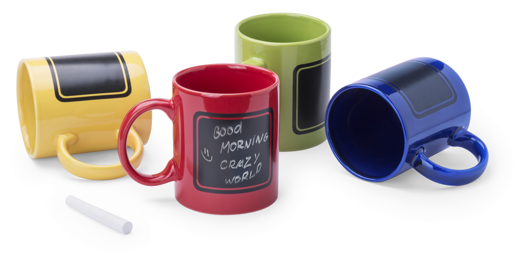 Taza de cerámica de 370ml de capacidad en divertida gama de vivos colores y con zona negra pizarra para pintar. Tiza incluida y presentada en caja individual. 370 ml. Presentación Individual. Tiza Incluida