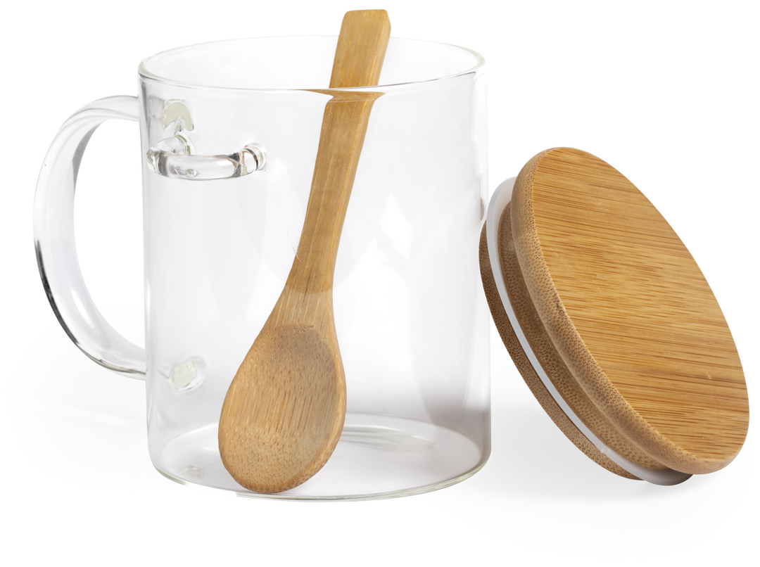 Taza de línea nature de 420 ml de capacidad. Fabricada en cristal de borosilicato, que ofrece una resistencia y durabilidad excepcionales, alargando su vida útil y pudiendo ser reutilizada infinidad de veces. Con tapa y cuchara de bambú pulido, presentada 420 ml. Presentación Individual