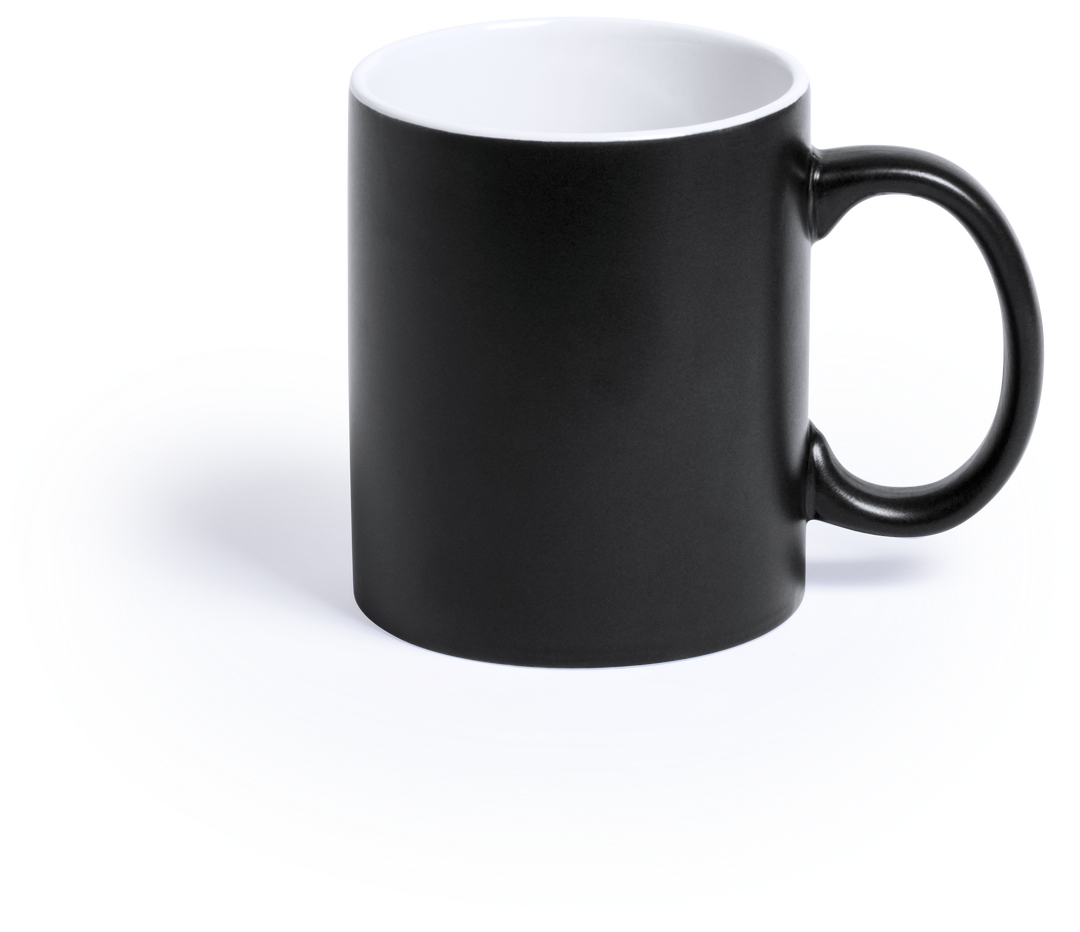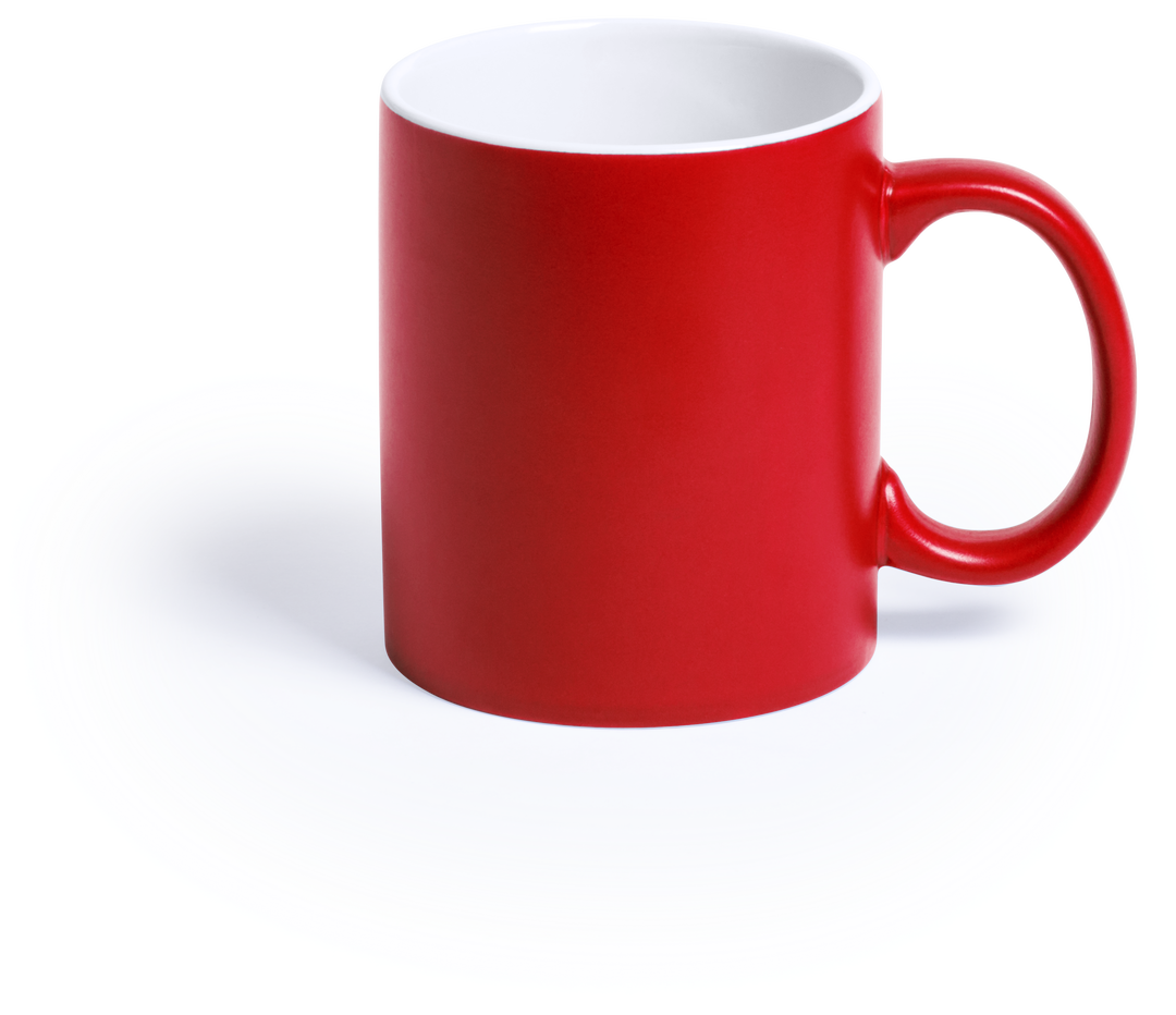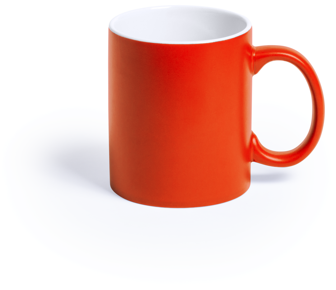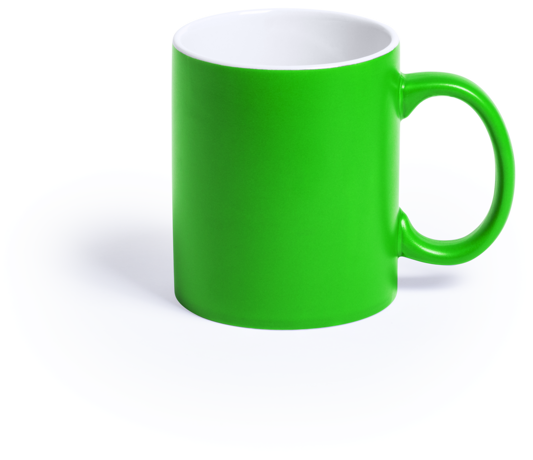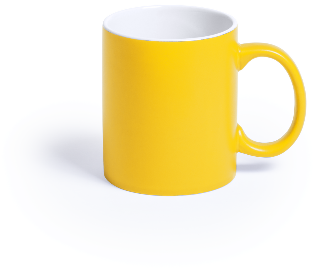 Taza de cerámica de alta calidad de 350ml de capacidad. Parte exterior en vivos colores, especialmente diseñada para marcaje en láser, e interior en color blanco. Al grabar el logotipo en la parte exterior, se muestra el color del interior de la taza. Pre 350 ml. Presentación Individual