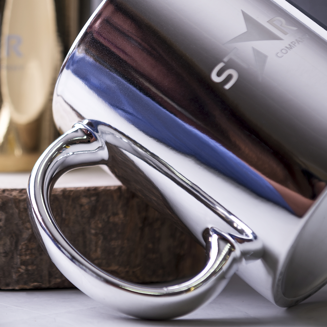 Taza de cerámica de 350ml de capacidad. Disponible en llamativos colores plateado y dorado brillantes. Especialmente diseñada para marcaje en láser y con un recubrimiento exterior especial para que tu publicidad quede perfectamente grabada en color blanco 350 ml. Presentación Individual