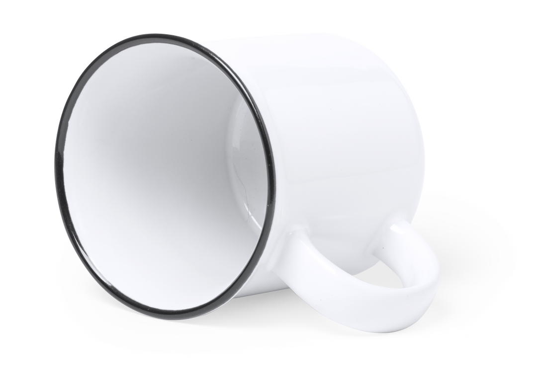 Taza de cerámica de 300ml de capacidad con diseño vintage. En elegante diseño bicolor, con anilla coloreada en el borde y cuerpo en color blanco. Especialmente diseñada para marcaje en sublimación. Presentada en caja individual. 300 ml. Presentación Individual