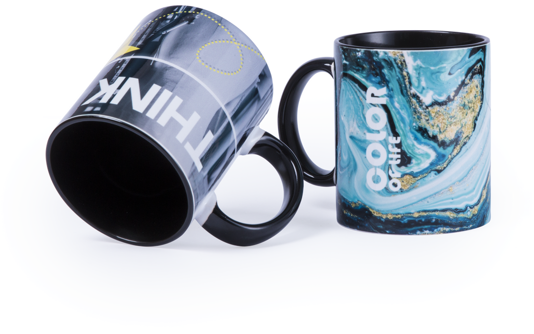 Taza de cerámica de 350ml de capacidad con exterior en color blanco e interior en vivos y variados colores. Especialmente diseñada para marcaje en sublimación. Presentada en caja individual. 350 ml. Presentación Individual