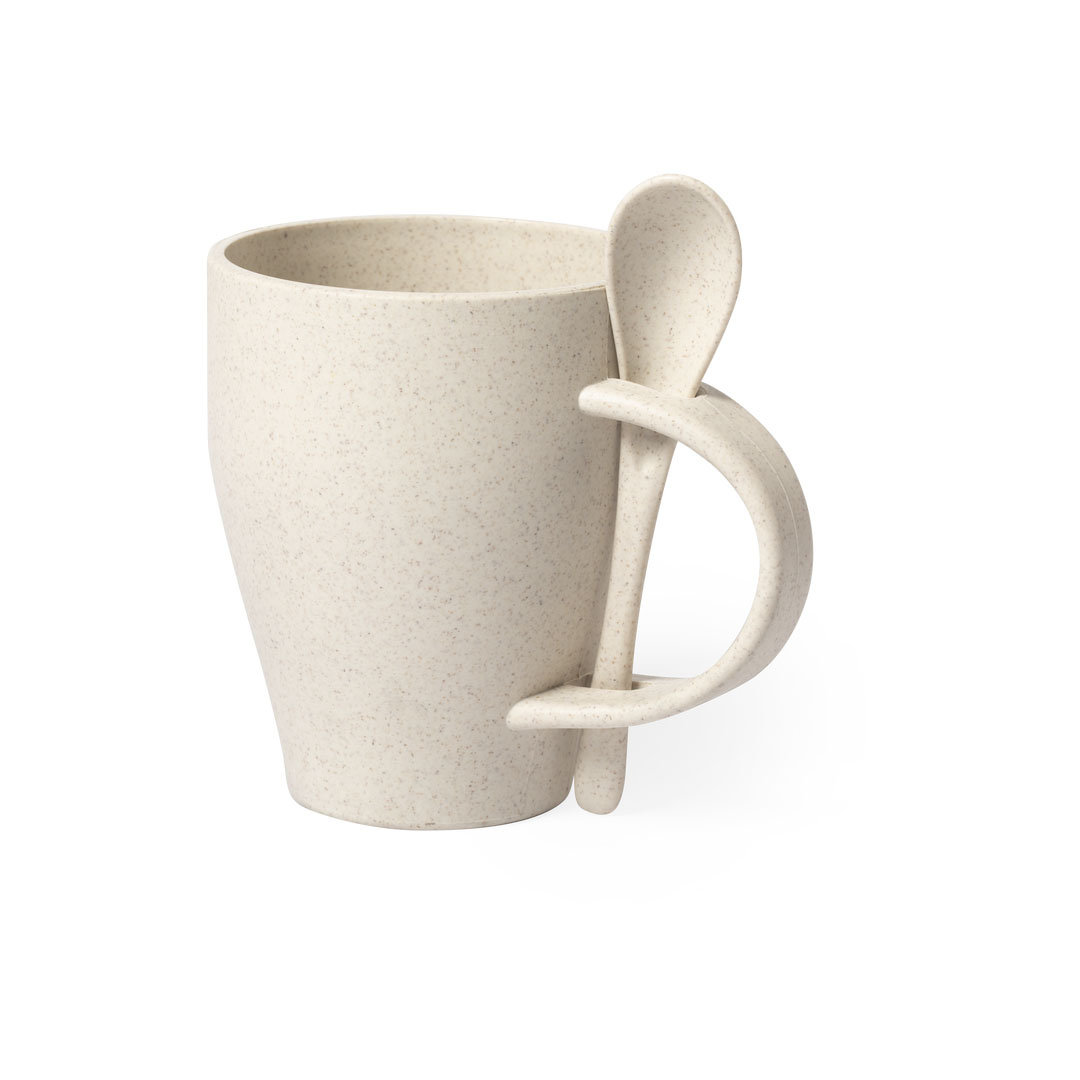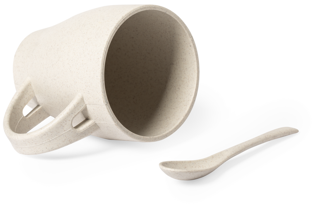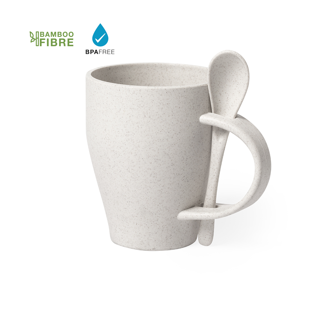 Taza de línea nature de 400 ml de capacidad. Fabricada en fibra de bambú, con cuchara a juego integrada en asa. 400 ml