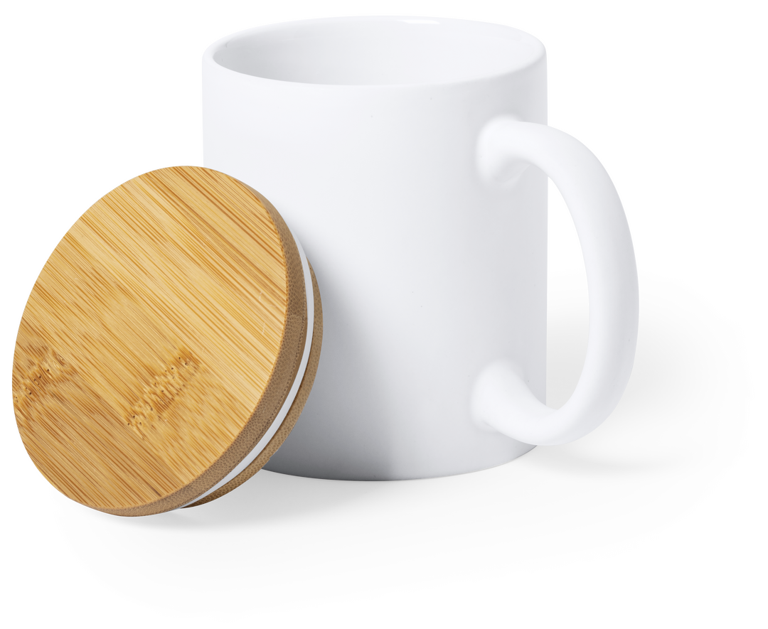 Taza de línea nature de 370 ml de capacidad. Fabricada en cerámica de acabado mate, con tapa de bambú pulido y presentada en caja individual de diseño eco. 370 ml. Presentación Individual