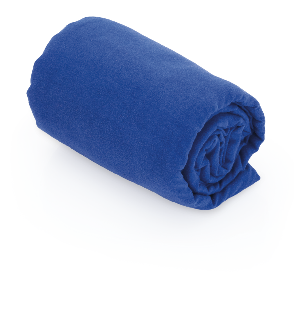 Toalla de 138x72cmcm en absorbente y suave microfibra de 200g/m2 en variados colores. Presentada en práctica bolsa de transporte de redecilla con accesorio de ajuste. Plegado Ø 9 x 17 cm