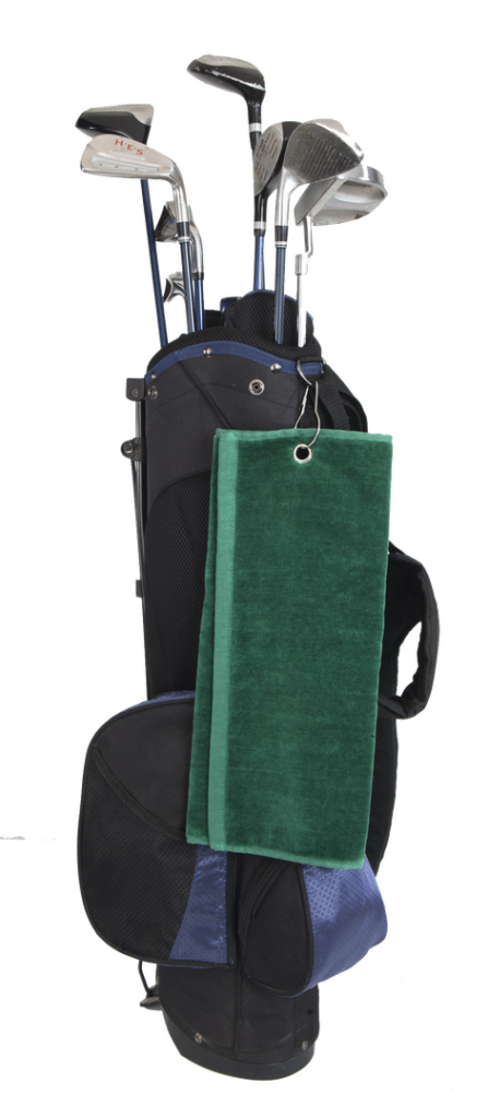 Toalla de golf de 40x50cm en absorbente y suave algodón de alta calidad de 650g/m2. Con argolla reforzada y mosquetón de acople, ambos de acero inox. Plegado 19 x 40 cm