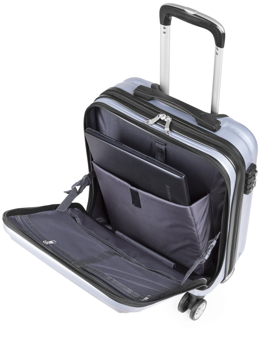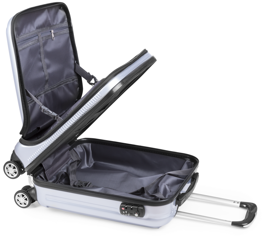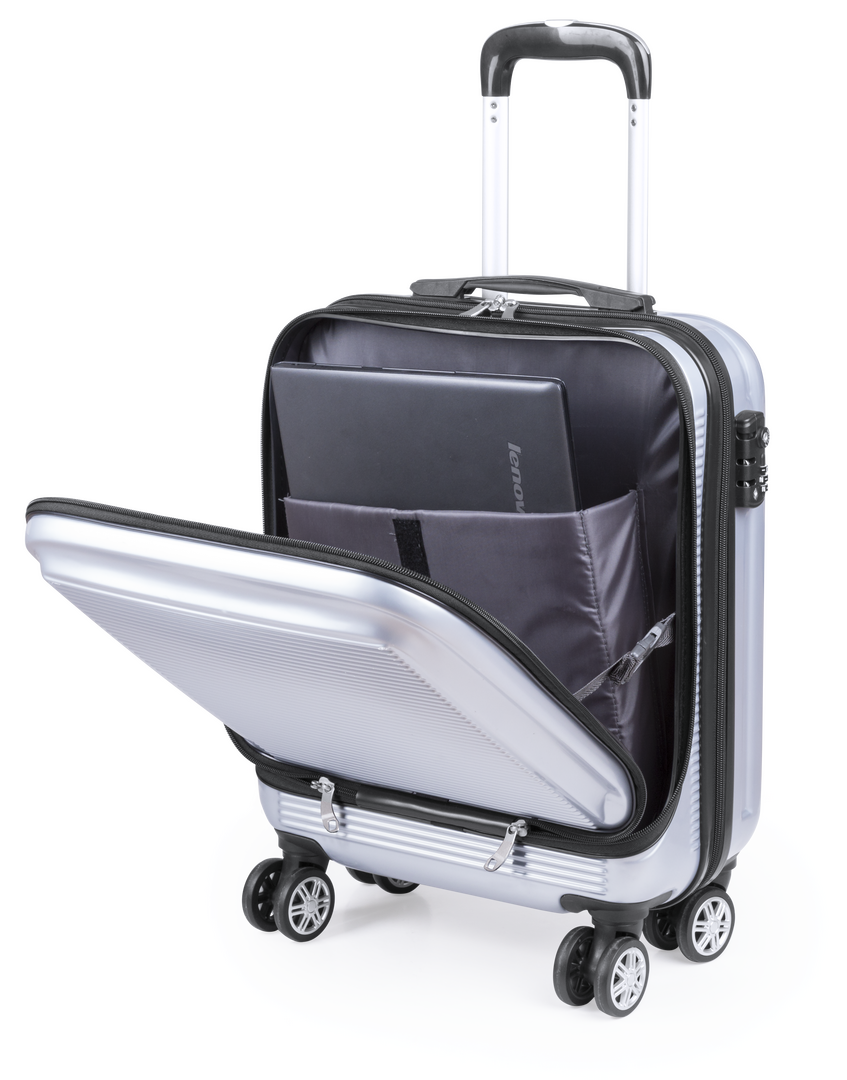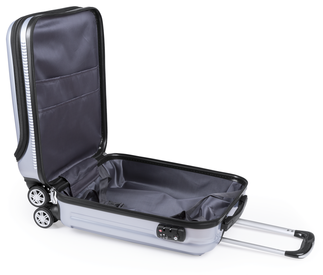 Trolley de negocios rígido en resistente material en acabado plateado. De apertura total, con 4 ruedas giratorias y cierre de seguridad por contraseña. Cierre conforme a los estándares TSA -Administración de la Seguridad en el Transporte-, que permite a l Rígido. 4 Ruedas Giratorias. Bolsillo Acolchado para Portátil. Cierre Seguridad TSA Incluido