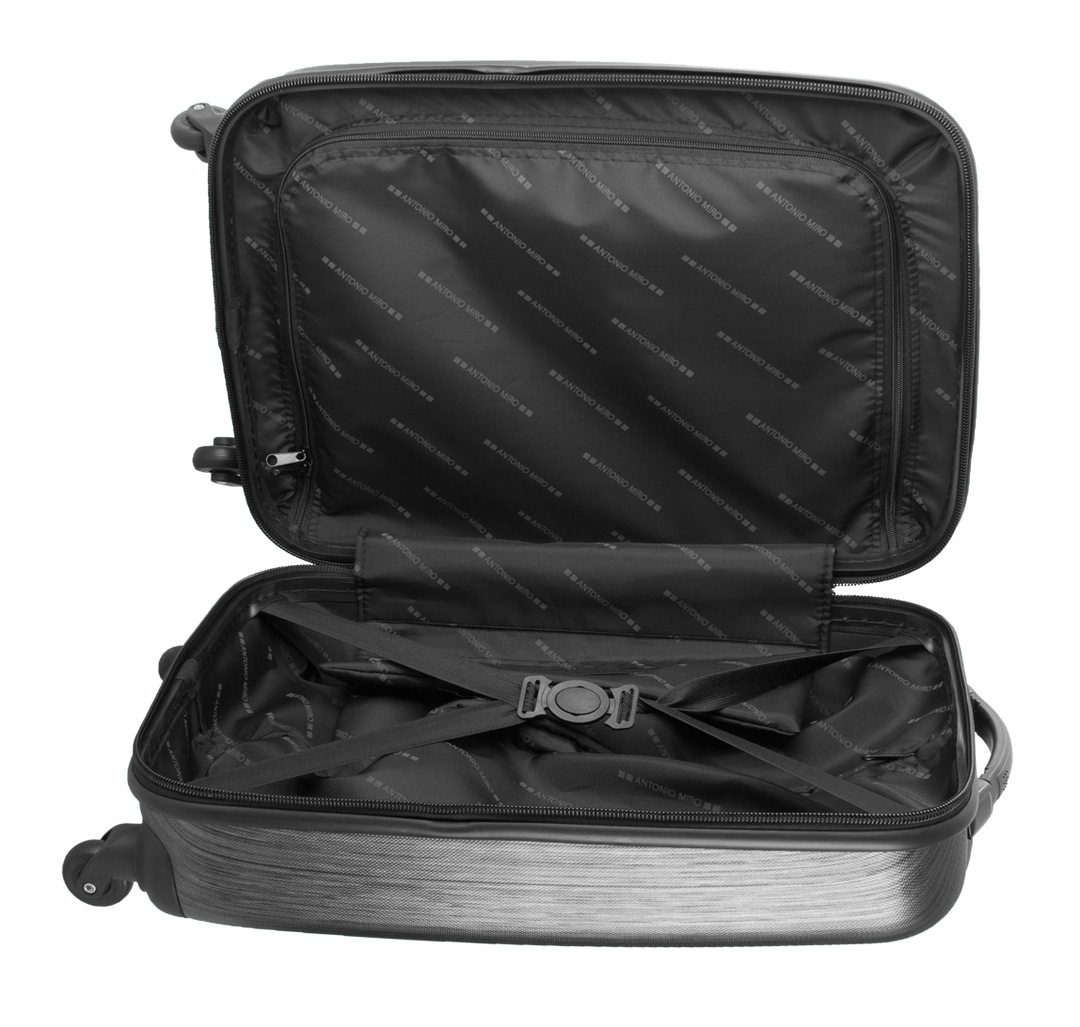 Trolley de Antonio Miró de 4 ruedas telescópicas en material ABS rígido de alta resistencia y elegante diseño de cuadros. Compartimento principal con cierre de cremallera de doble tirador y lateral con cierre de seguridad de combinación numérica. Con asa Rígido. 4 Ruedas Giratorias