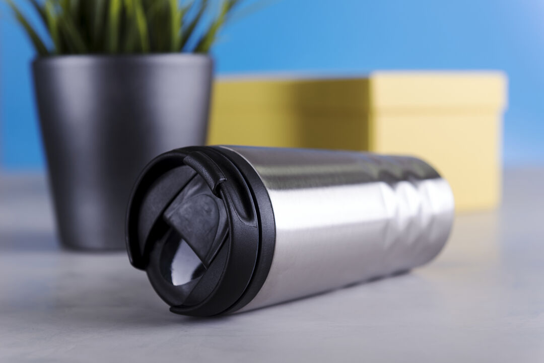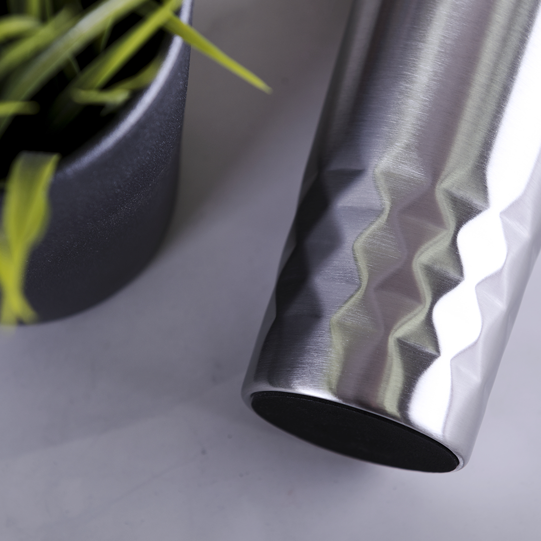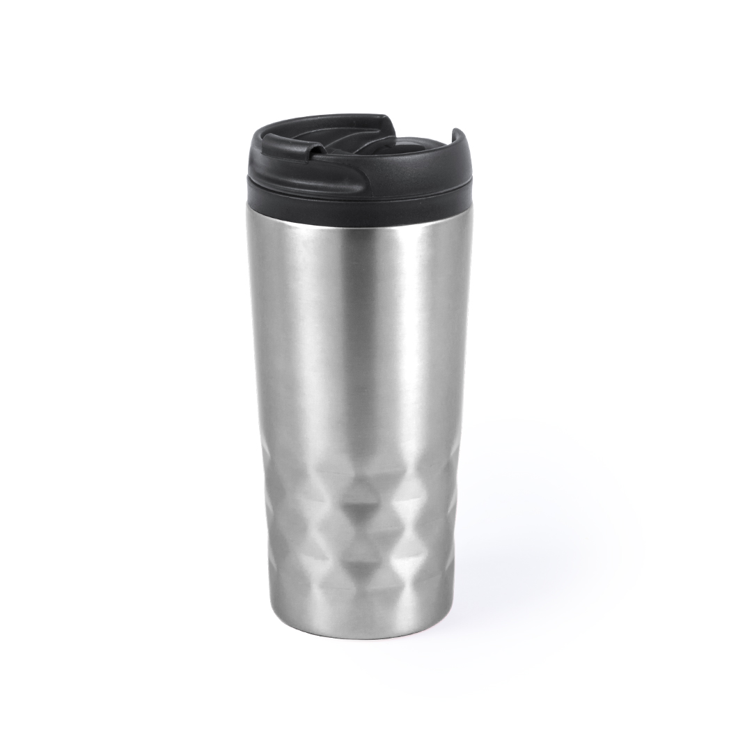 Vaso de acero inox de 310ml de capacidad con cuerpo en vivos colores de acabado brillante y diseño en rombos. Con tapa dosificador de seguridad y base acolchada de suave espuma. Presentado en caja individual. 310 ml. Presentación Individual