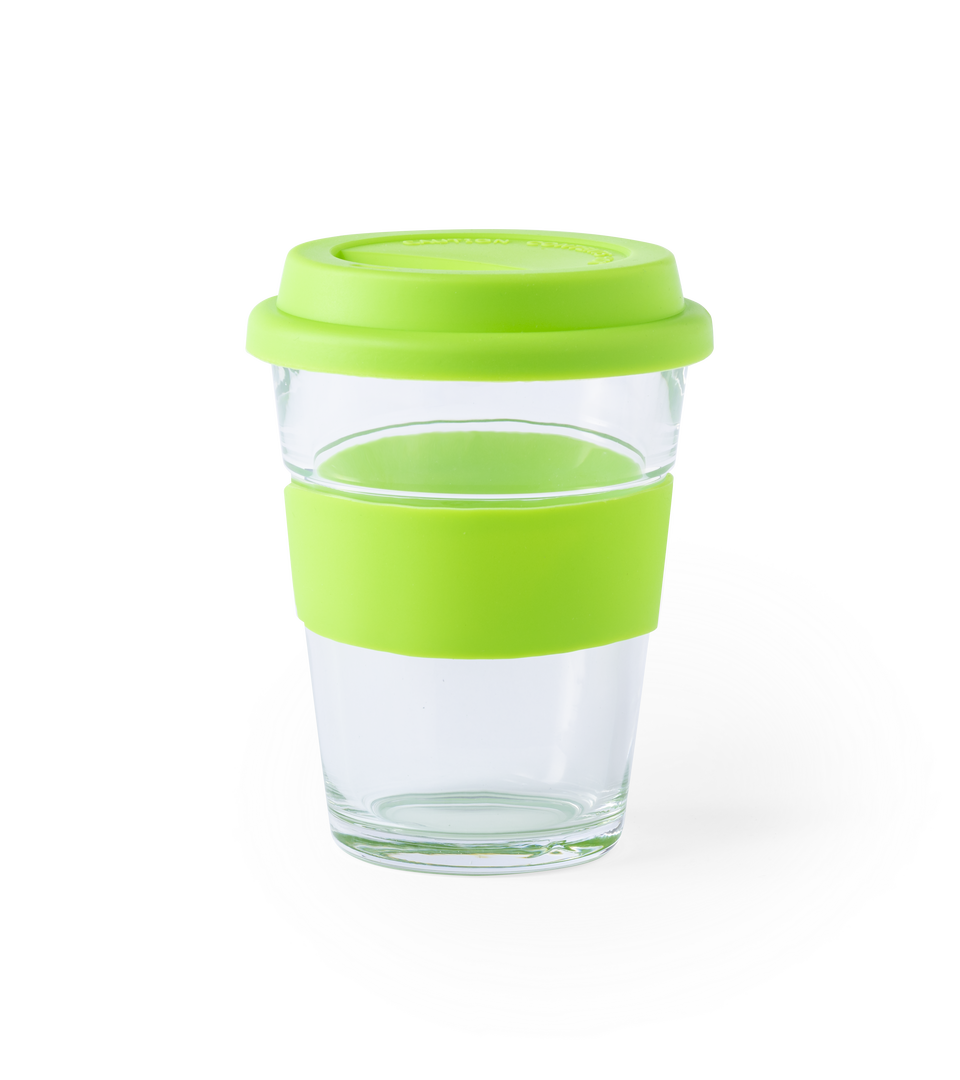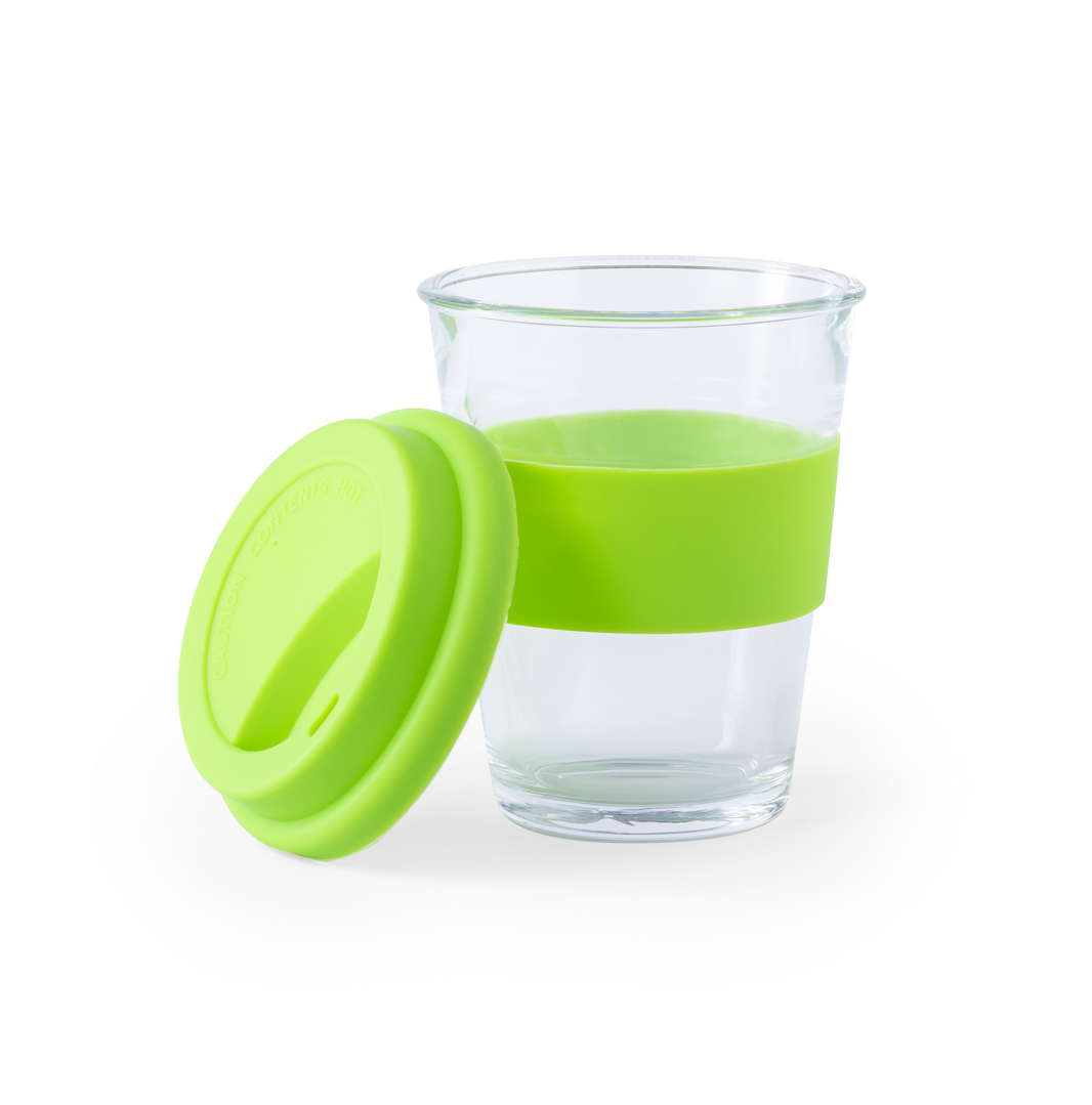 Vaso de cristal y 350ml de capacidad. Con tira antiquemaduras y tapa de silicona a juego en variada gama de colores. Presentado en caja individual de atractivo diseño. 350 ml. Presentación Individual