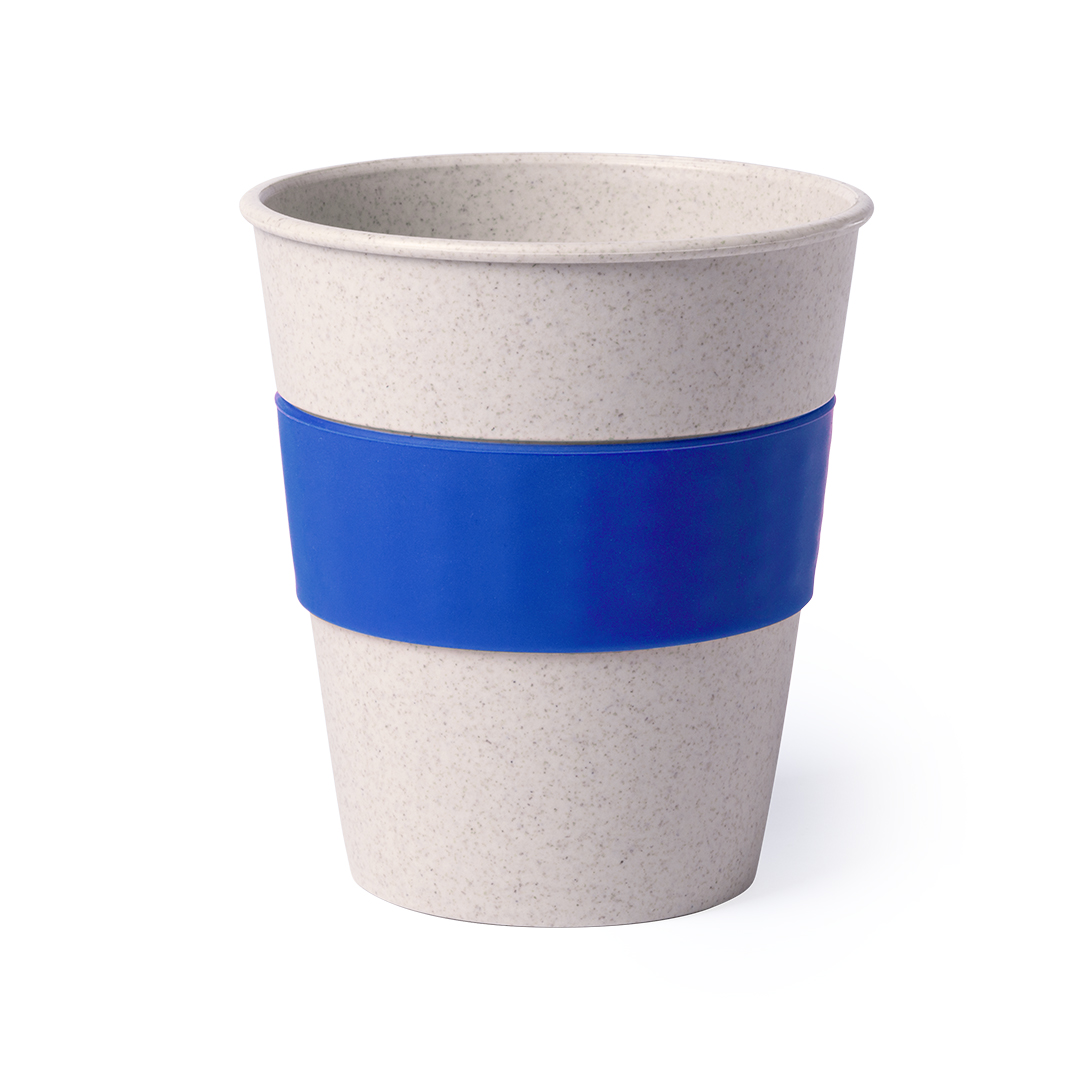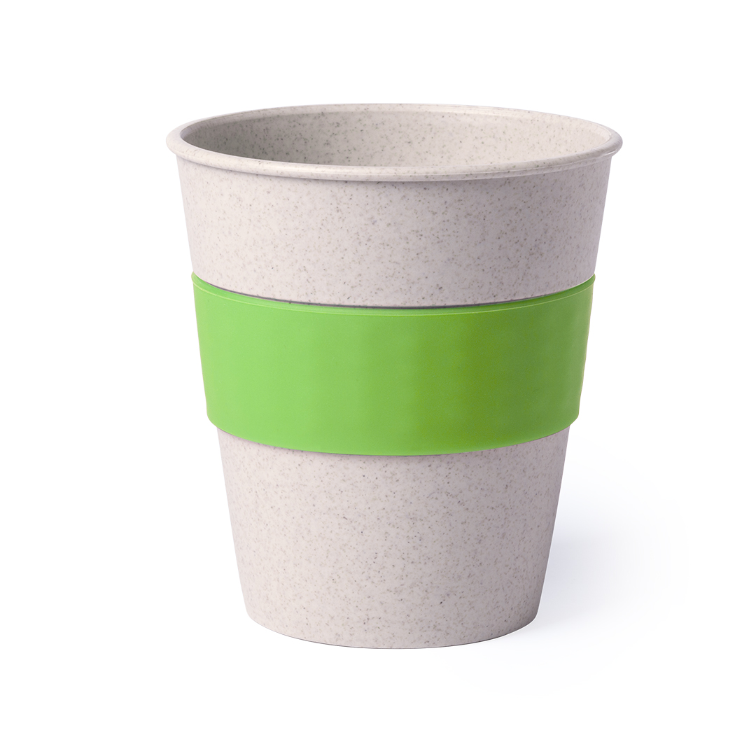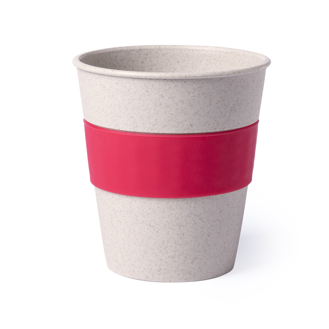 Vaso de línea nature en combinación de fibra de bambú y PP. De 380ml de capacidad y combinación de cuerpo en color crudo con tira antiquemaduras de silicona en variados colores. 380 ml