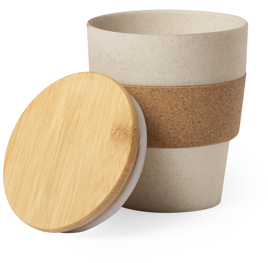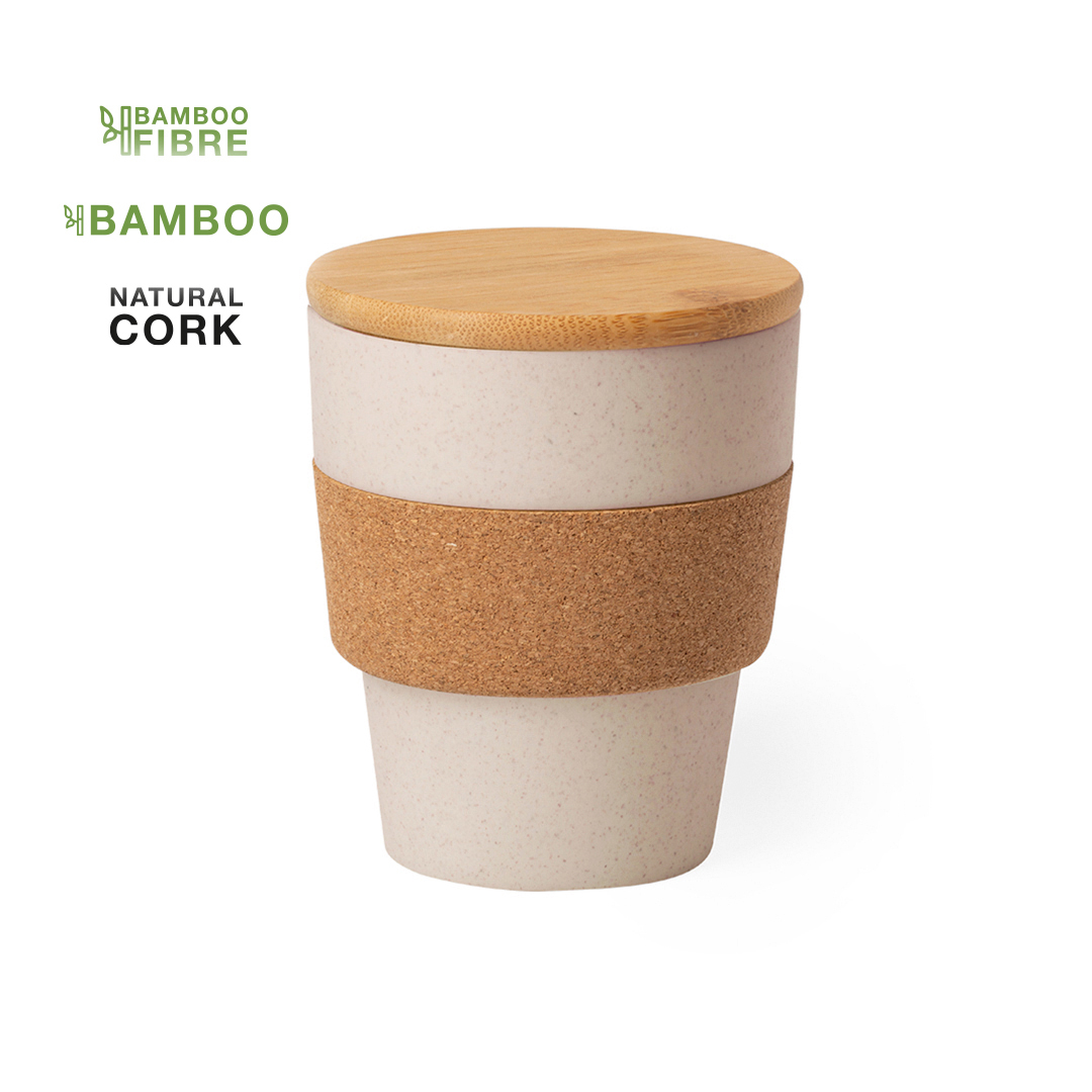 Vaso de línea nature, fabricado en corcho natural, bambú y fibra de bambú. 350 ml de capacidad, con tapa en bambú pulido, libre de BPA. Presentado en atractiva caja de diseño eco. 350 ml. Presentación Individual