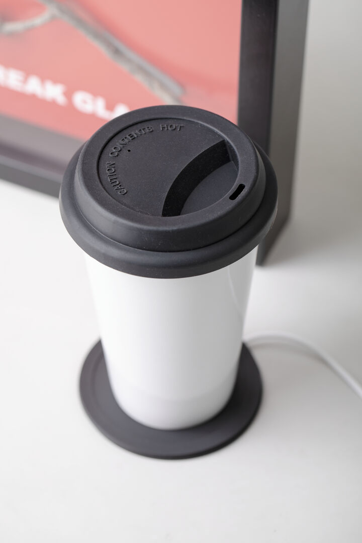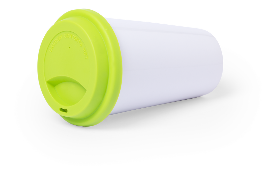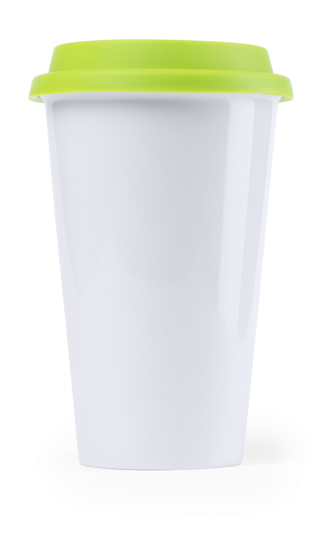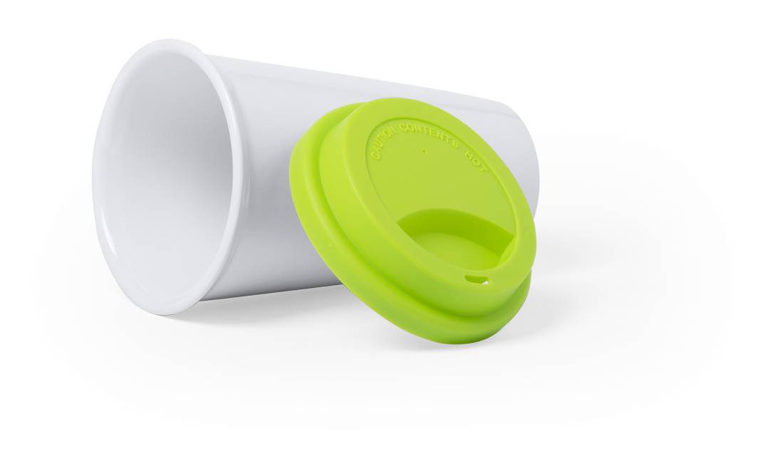 Vaso de cerámica de 400ml de capacidad original diseño bicolor, con vaso en color blanco y tapadera de silicona en variada gama de colores. Presentado en caja individual. 400 ml. Presentación Individual