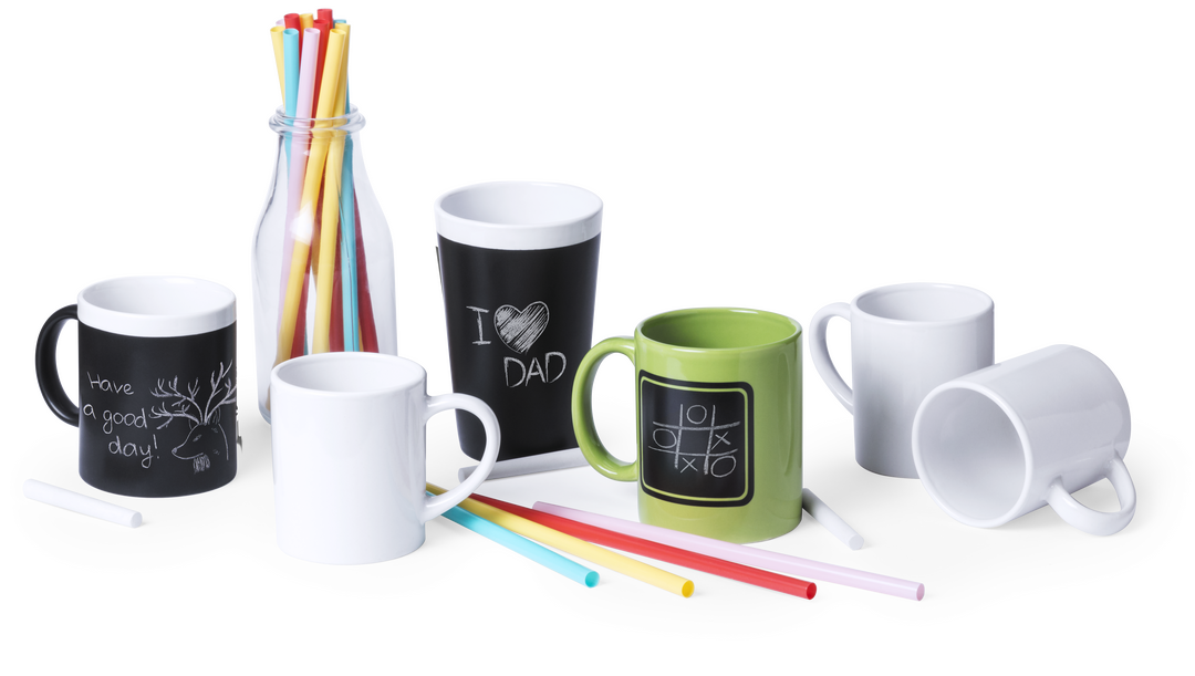 Vaso de cerámica de 460ml de capacidad con cuerpo negro pizarra para pintar. Tiza incluida y presentada en caja individual. 460 ml. Presentación Individual. Tiza Incluida