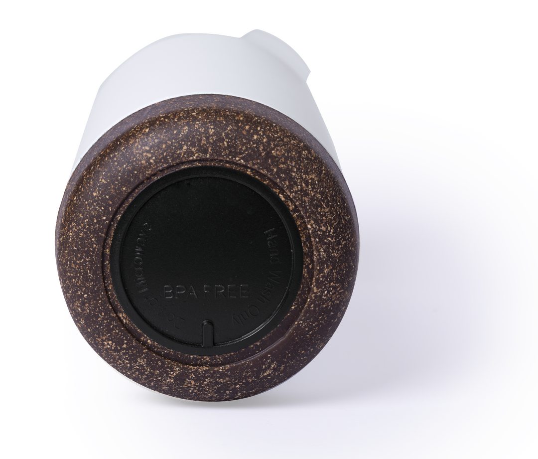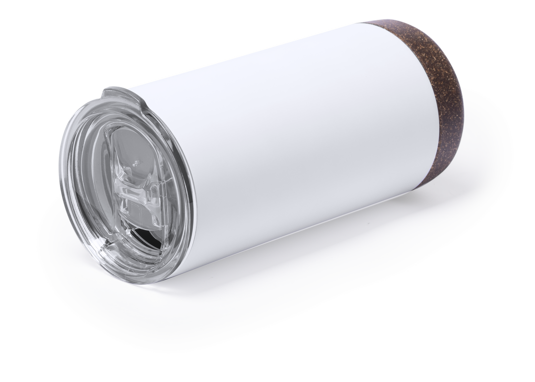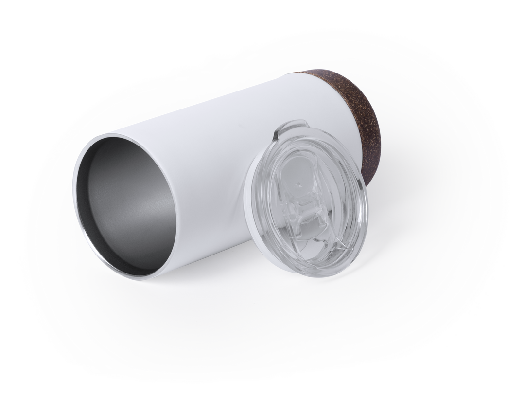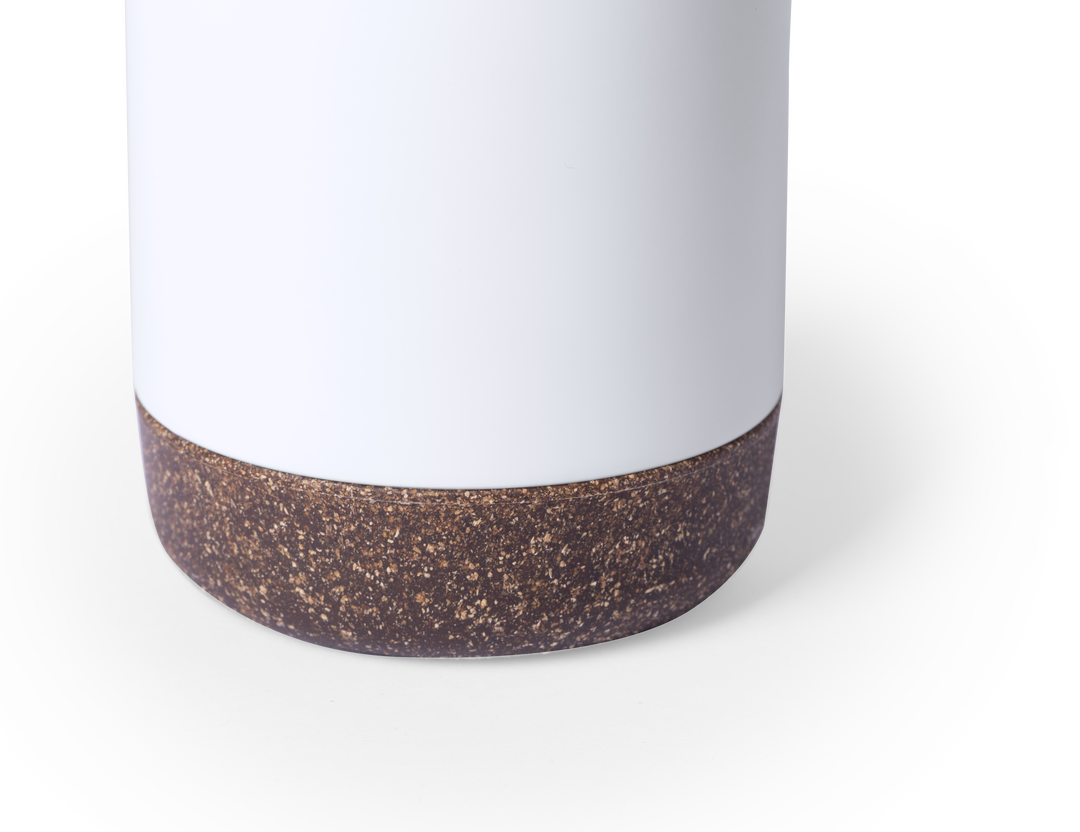 Vaso en 500 ml de capacidad, de línea nature en combinación de base en corcho natural con cuerpo en acero inox de acabado blanco. Con doble cobertura para mejor y mas duradera conservación de la temperatura y original tapón dosificador transparente. Prese 500 ml. Presentación Individual
