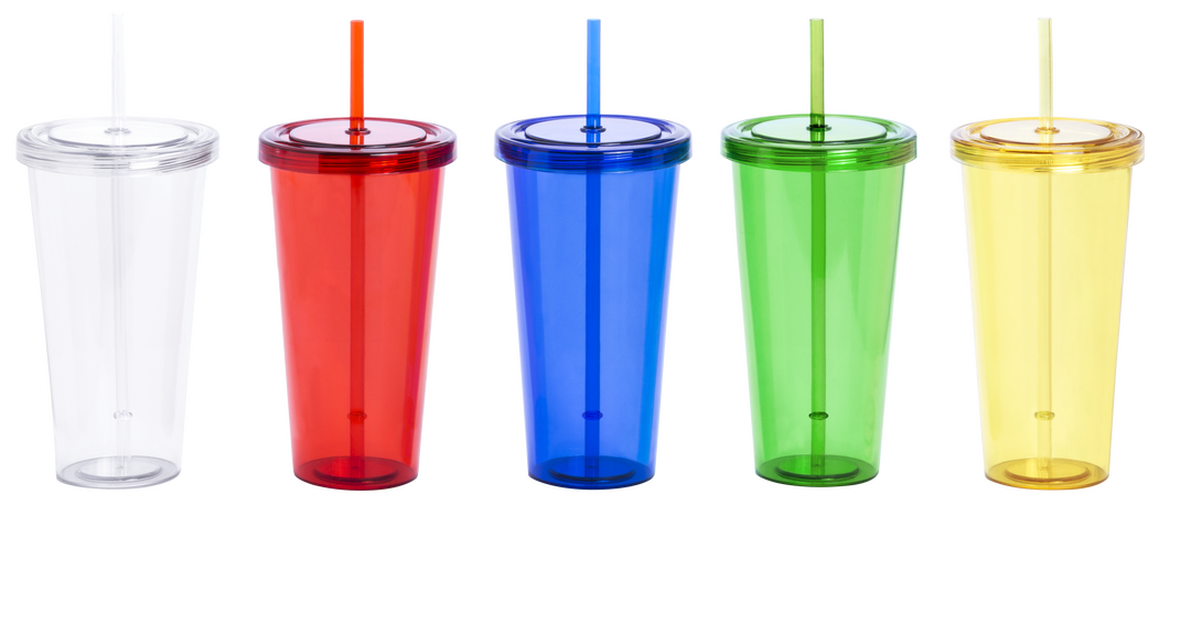 Divertido vaso de PS de 750ml de capacidad con cuerpo transparente en variada gama de vivos colores. Con tapa a rosca y pajita a juego. 750 ml