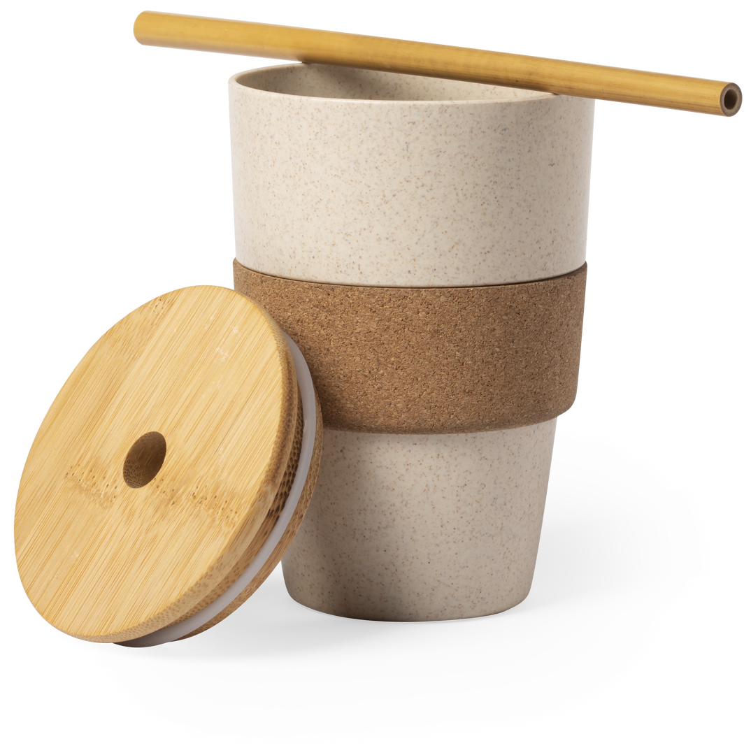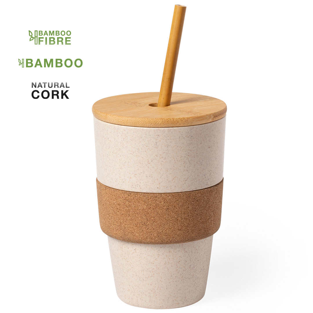 Vaso de línea nature, fabricado en corcho natural, bambú y fibra de bambú. 450 ml de capacidad, con tapa en bambú pulido y pajita, libre de BPA. Presentado en atractiva caja de diseño eco. 450 ml. Presentación Individual