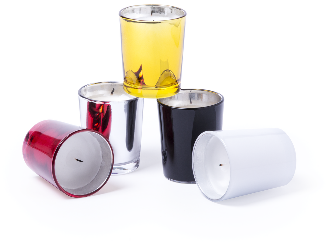 Original vela aromática en recipiente de cristal de vivos colores y variadas fragancias. Disponible en aromas café, pino, lavanda, vainilla y fresa. Presentada en caja individual.