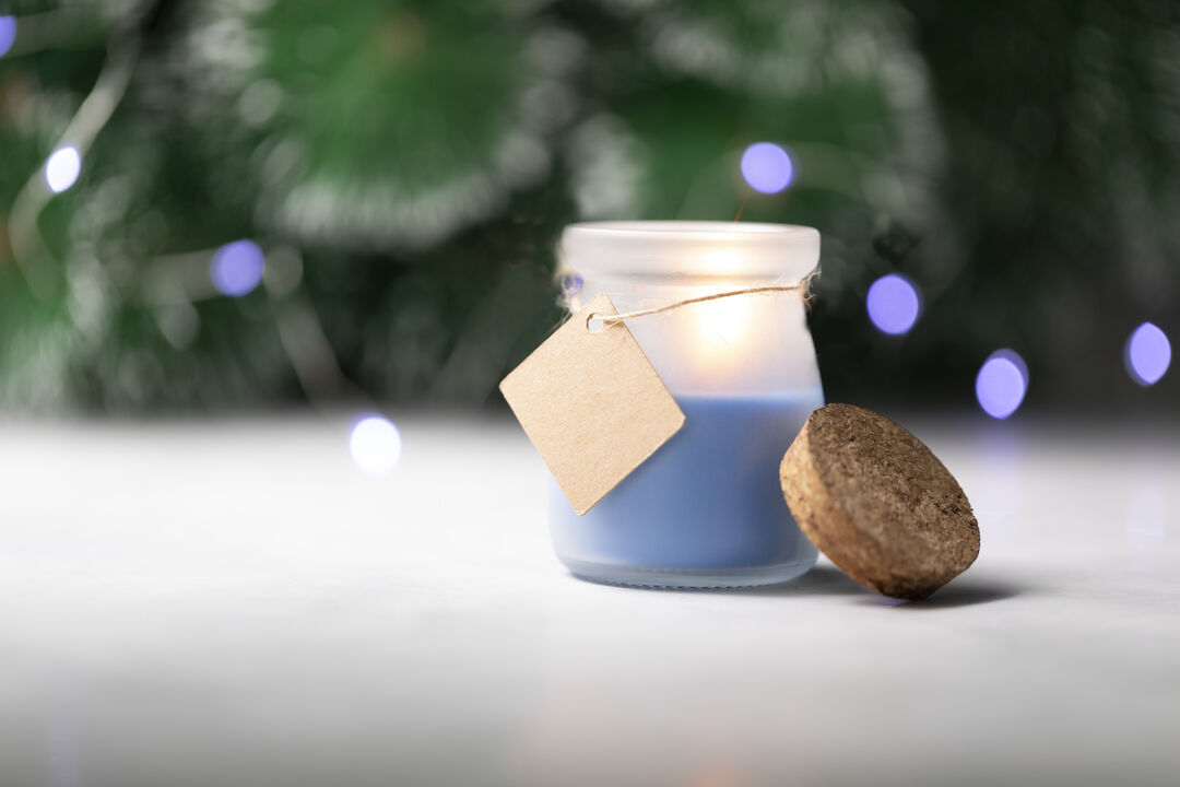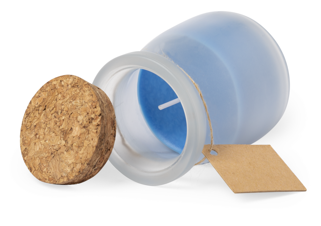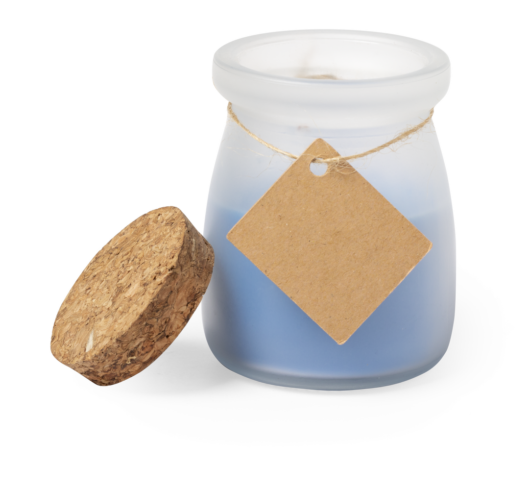 Original vela tarrito de cristal. Con tapón de corcho y etiqueta de cartón reciclado con hilo para mensajitos. Disponible en varios colores y presentada en caja blanca individual.
