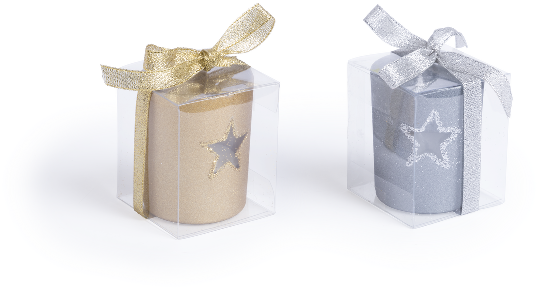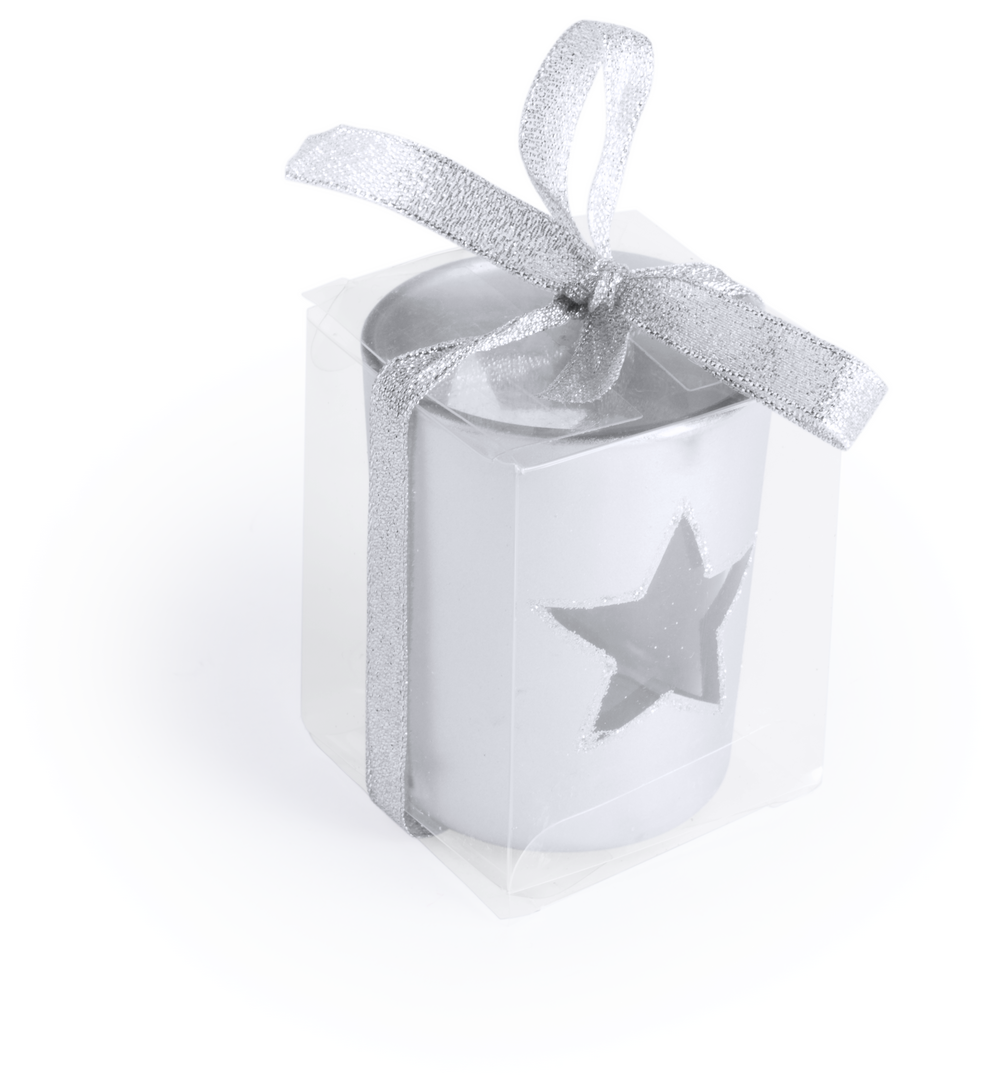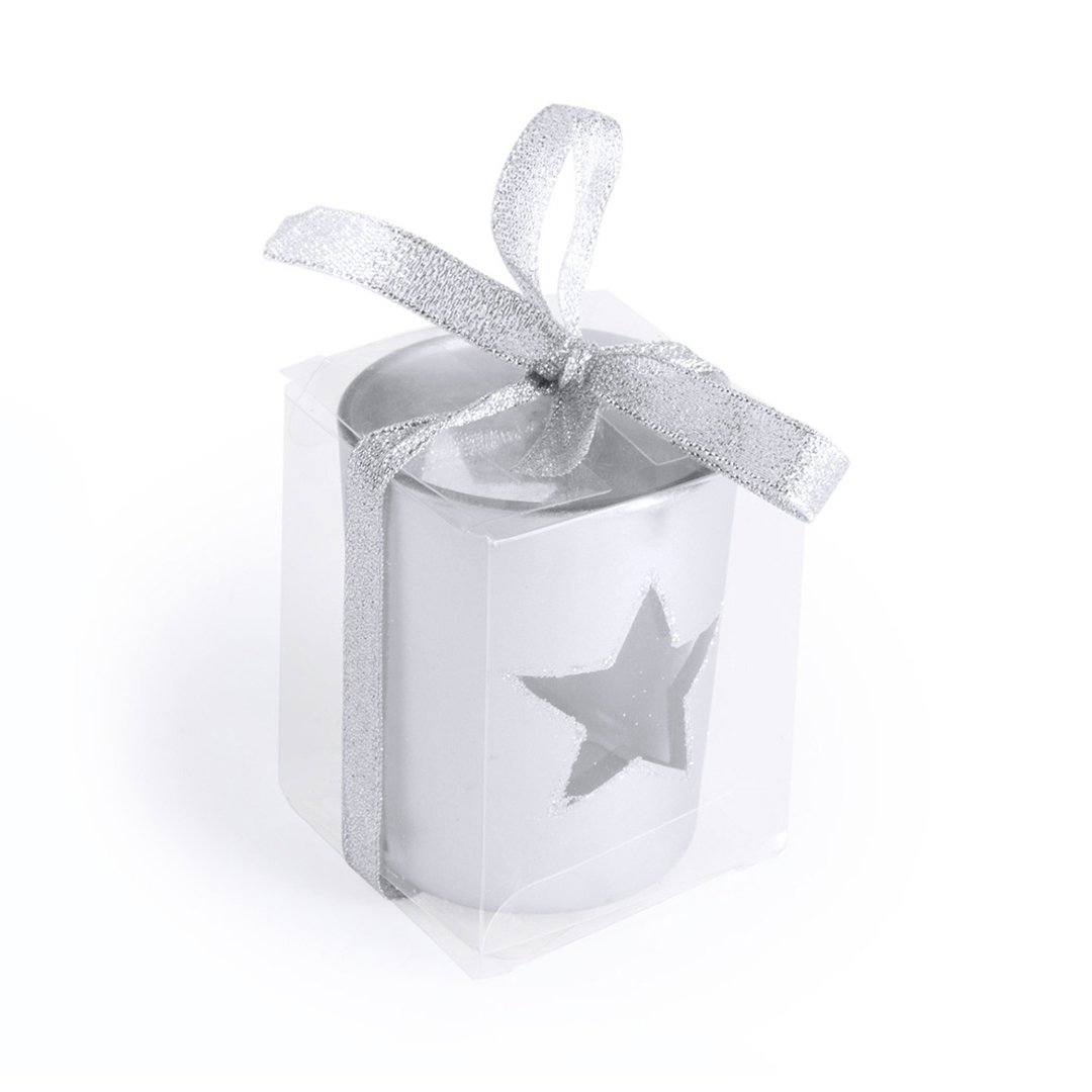 Vela de navidad en con recipiente de cristal en diseño de estrella. Presentada en cajita individual de PVC.