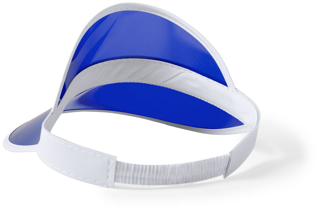 Original visera de PVC con protección UV. Acabada en colores transparentes en combinación con detalles de color blanco. Con cinta elástica ajustable y disponible en variada combinación de colores. Protección UV