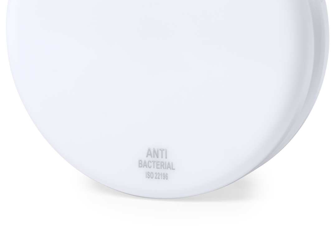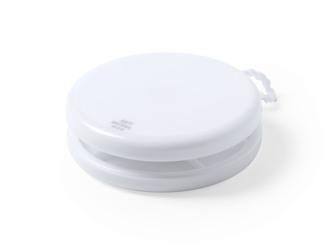 Yoyó antibacteriano de PS en color blanco sólido, con hilo rizado de algodón a juego de 100 cm. Presentado bolsa individual. Los productos con tratamientos antibacterianos son capaces de reducir drásticamente las cargas bacterianas presentes en las super
